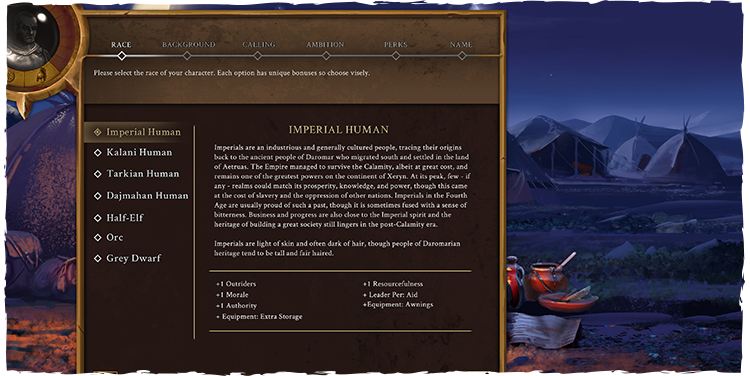 Another way to spice things up a bit is character background. These are former professions or occupations (for example, aristocrat, veteran, criminal, scholar, or priest) and they provide additional Perks and resources to your character. Of course, not all combinations are possible - you won't see an Orc Slaver, nor an Imperial Savage.