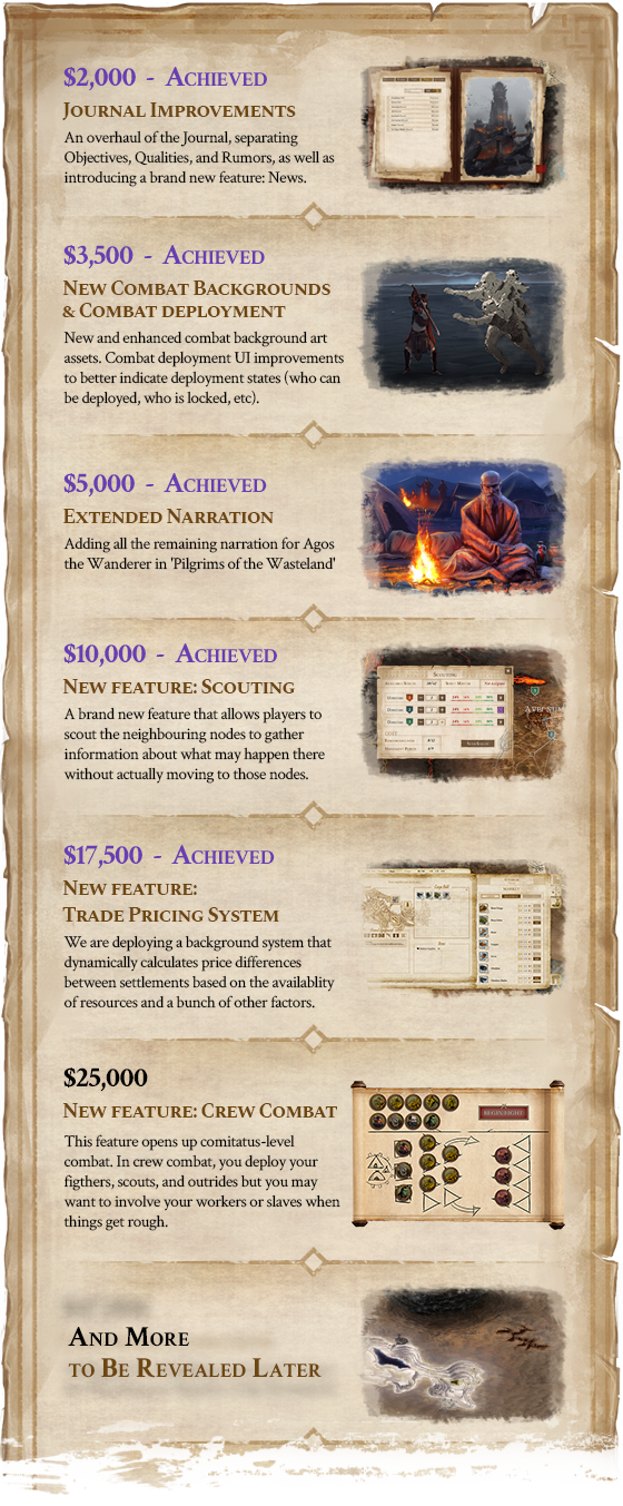 The next big thing. Having fighters and outriders in your crew might have given it away already that they would play an important role during your journeys across the wastelands of the continent. The feature that builds on them is crew combat. The design of this feature is in quite an early stage - we are in the process of prototyping our ideas. The main objective is very clear, though: we would like to give the option to players to get through random encounters using this feature instead of the slower companion combat. Players in most cases could pick between those two allowing them to build on their strengths. Of course, there will be many engagements where it is predefined which combat type - or even both - takes place.
