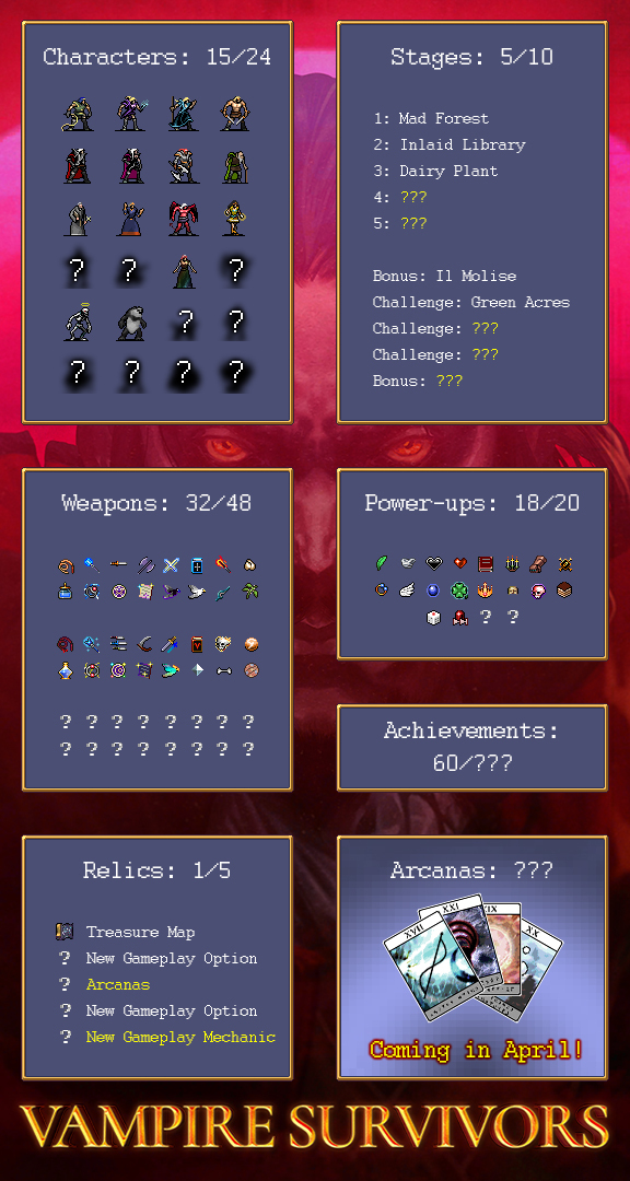 When Vampire Survivors first released on Steam in Early Access, it was estimated to be at 60% content completion. The game had 7 playable characters, 22 weapons, 12 power-ups, 1 stage, and 23 achievements.