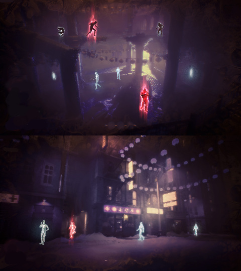 For the concept itself, we felt like a good direction would be colour-coding the types of blood resonance enemies and the public are experiencing. When they’re idle and unaware of us, a cool blue signifies their calm demeanour. When they’re actively hostile, a vivid red to show their blood pumping, their silhouette almost on fire.