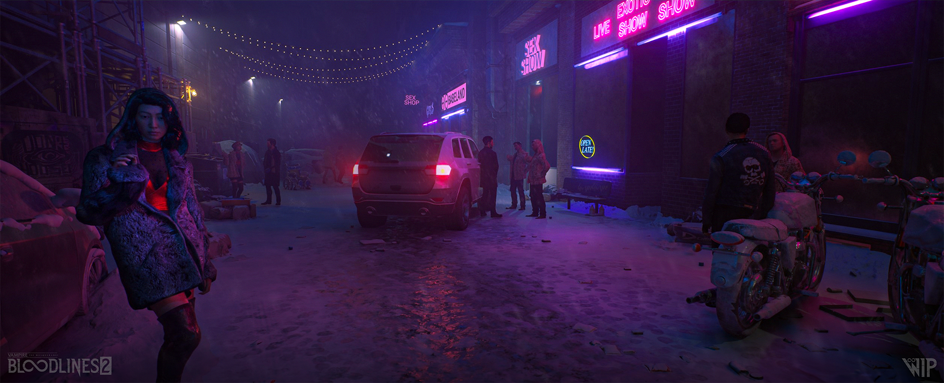 “In Bloodlines 2 my main focus is to guide you through the cold and looming backdrop that our Design and Environment Art teams have meticulously crafted over the past few years. These quests, set in our nocturnal version of Seattle, allow you to delve into the lives of its many Kindred inhabitants. Taking place after pivotal moments in the main questline, these adventures will offer you the chance to explore Seattle at your own pace. You will be visiting its Clan leaders, keeping the competition at bay and making decisions that will affect the outcome of your journey as Phyre. These are stuffed with Narrative and lore and I'll be taking you from the depths of the underground to the snow-capped high-rise rooftops.