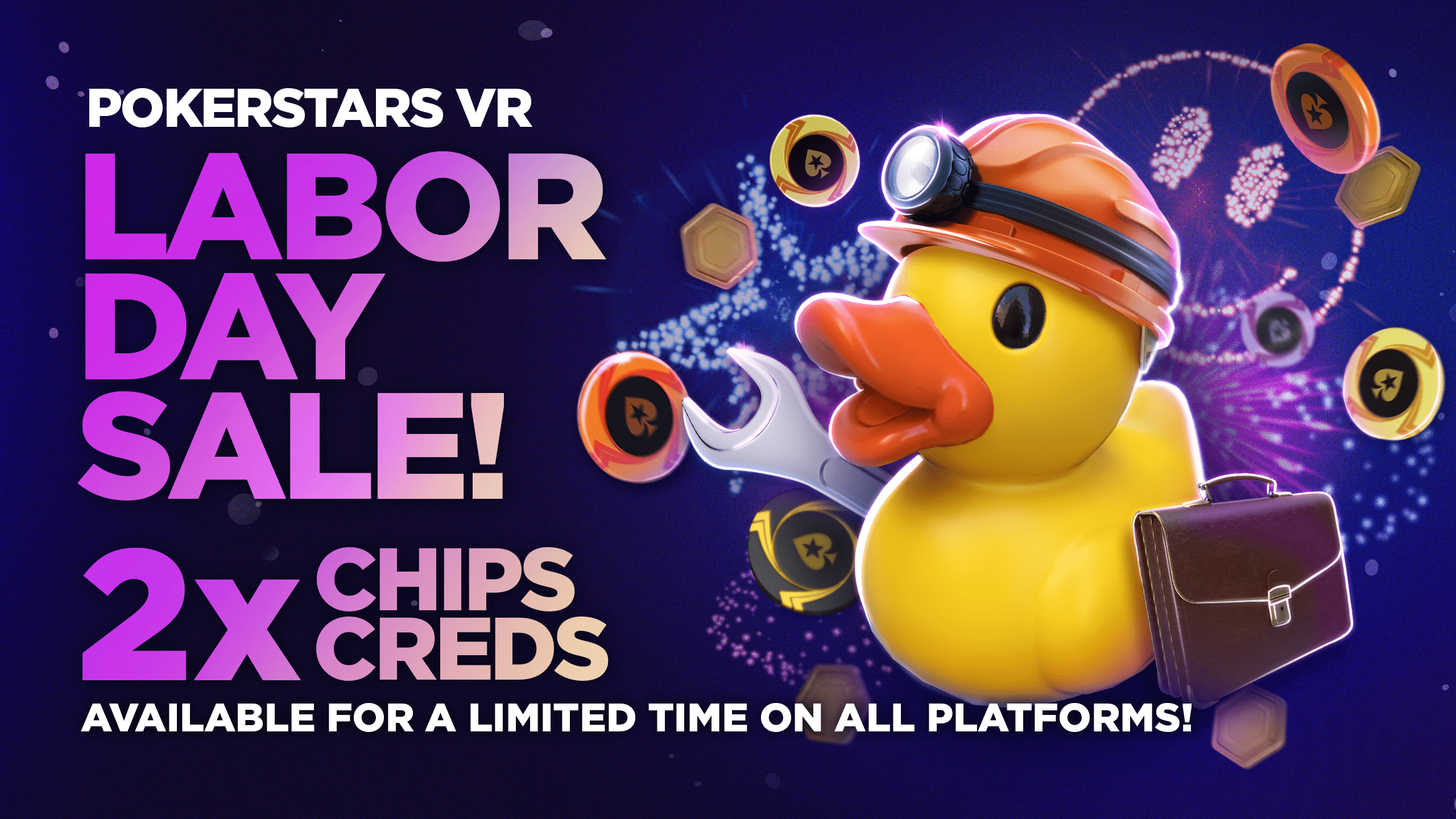 Treat yourself this weekend in PokerStars VR! To end the last weekend of August, we're bringing you an exclusive 2x Chips and Creds Sale! Don't miss out on this amazing opportunity to boost your bankroll and dominate the tables. See you at the felts!
