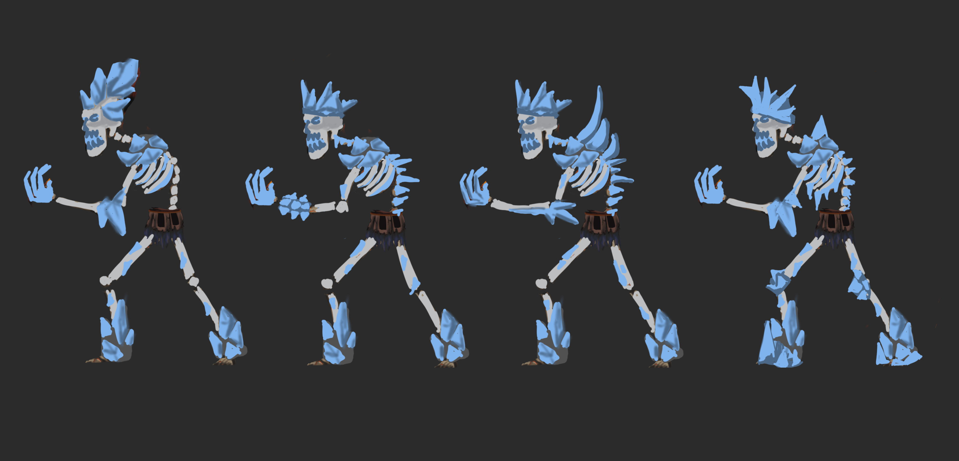 Since our game focuses a lot on the artistic component, one more talented artist joined us for visual design of mobs and bosses. Here are her first sketches of Icy Skeletons for the Cold House of Xibalba.