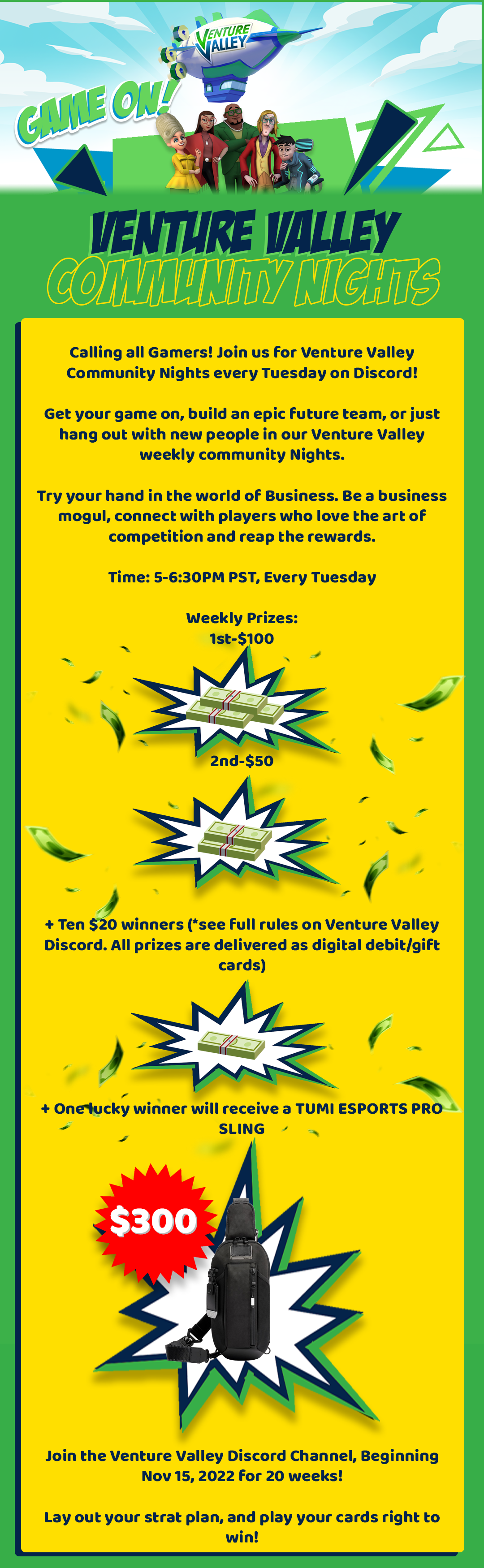Time: 5-6:30PM PST, Weekly Tuesdays Weekly Prizes: 1st-$100 2nd-$50 + Ten $20 winners (*see full rules on Venture Valley Discord. All prizes are delivered as digital debit/gift cards) + One lucky winner will receive a TUMI ESPORTS PRO SLING