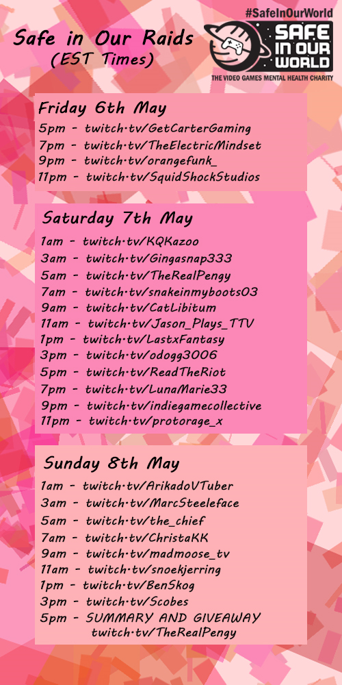 This weekend, Safe In Our World will be hosting a GIANT gaming livestream, entitled Safe In Our Raids, spanning all weekend from Friday May 6th - Sunday May 8th on Twitch! Across all 48 hours, you'll be able to watch a plethora of streamers playing all sorts of games, from little-known indie titles to AAA classics, in the hope of raising a whopping £2,500 to benefit mental health associations!