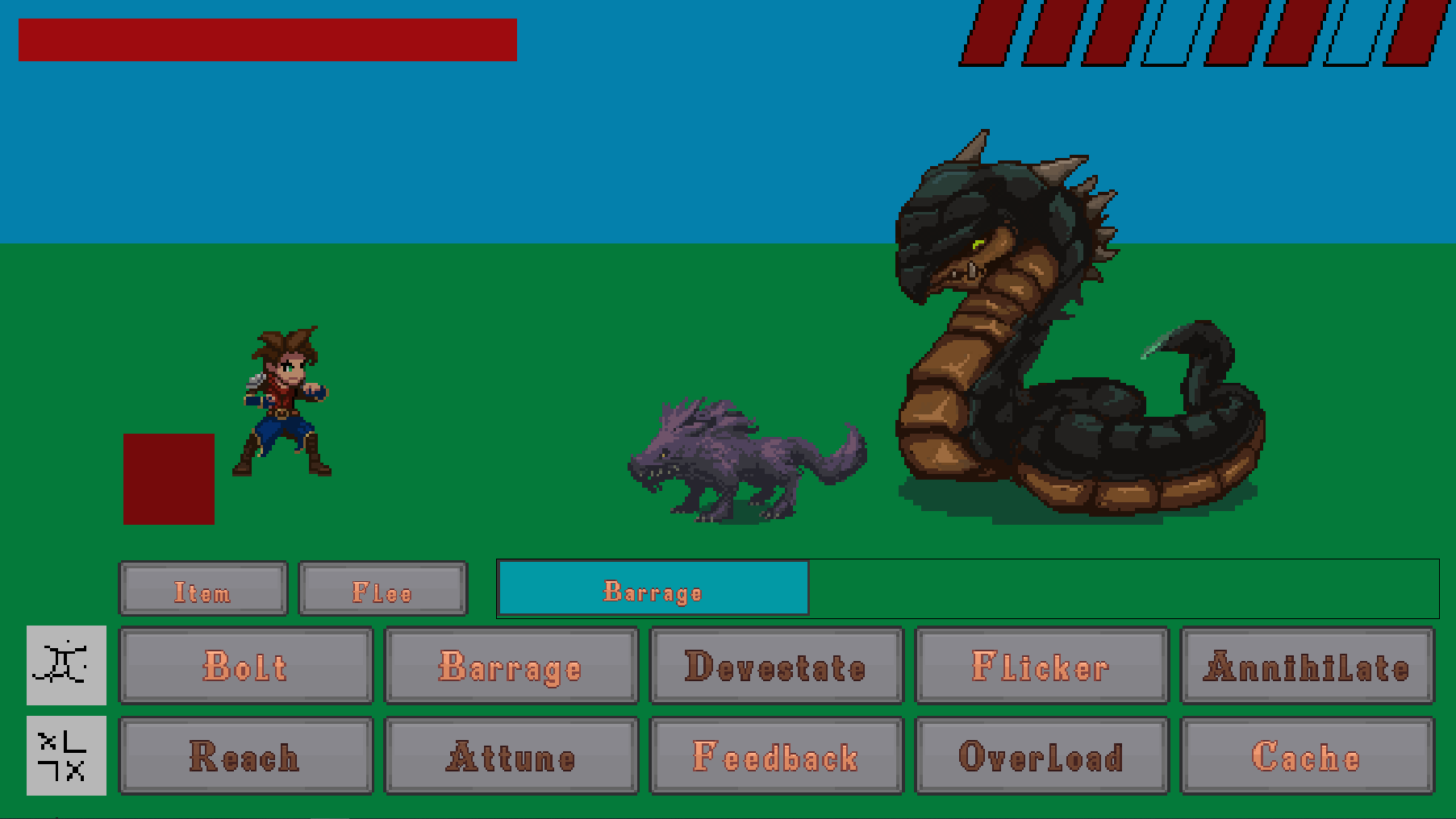 You also have your familiar (which currently looks like a red box) which you will also control. The familiar attunes elements and has a more simplified set of commands per element. In addition, you can flee obviously and use items.