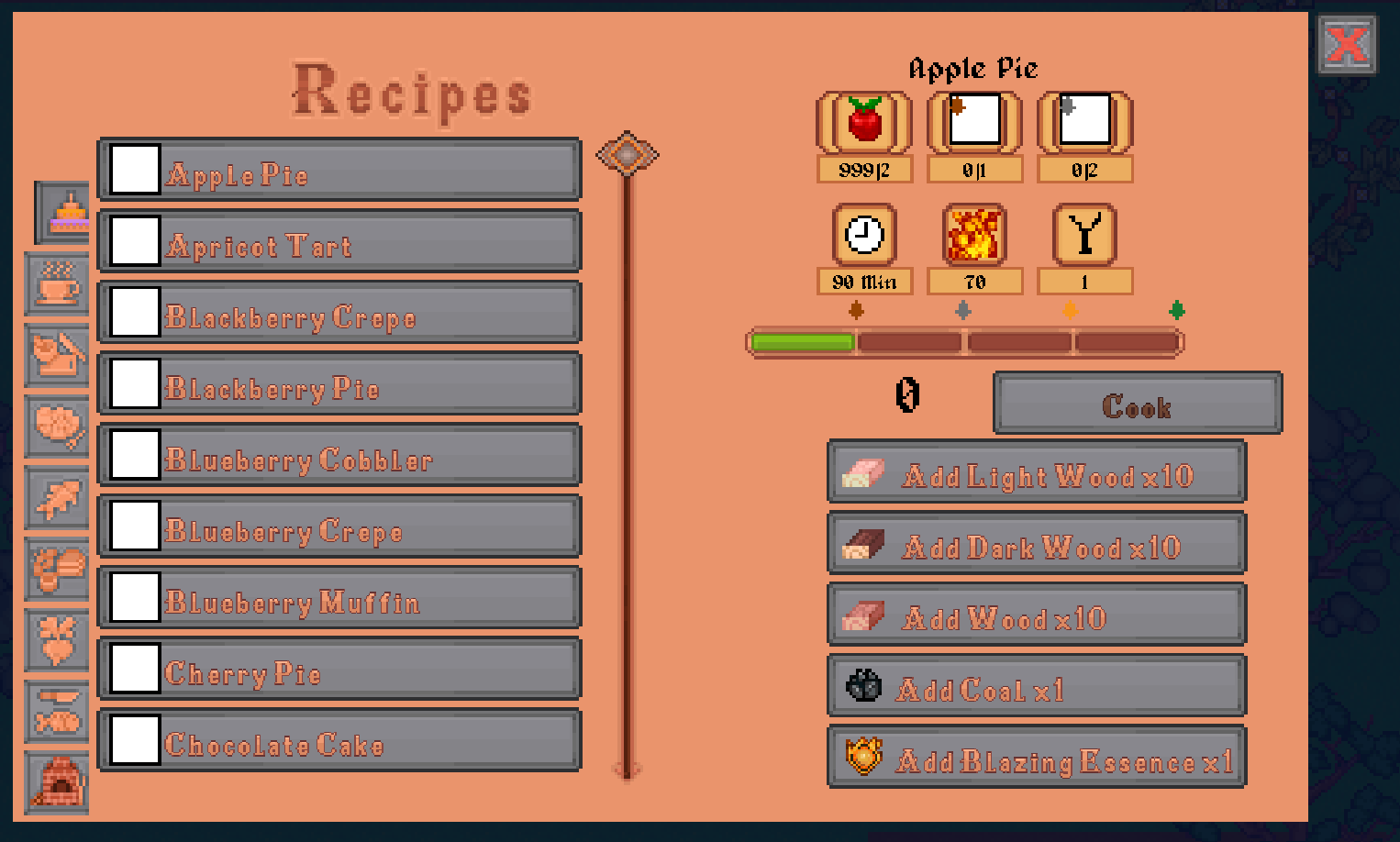 Aside from dialogue there is one other thing to address from this month. That would be quests. If you’ve played Verdant Village for any length of time you’ve probably done some quests. In general these are basically just tasks to fetch particular items for NPCs. Quests usually unlock something for you, furniture schematics, new systems like archeology or alchemy, or sometimes new areas. And so we come to the point of interest, recipes, specifically of the cooking variety.