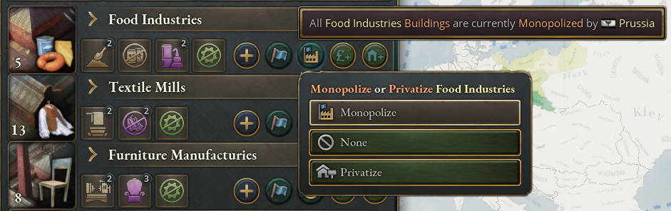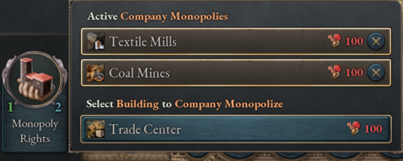 [p]Added Country Monopolies: Monopolies are not just limited to companies, countries can hold them too. Just like the Monopoly Charter, it prevents other actors in the country from building new levels. Monopolies also increase the market price of affected goods.[/p]