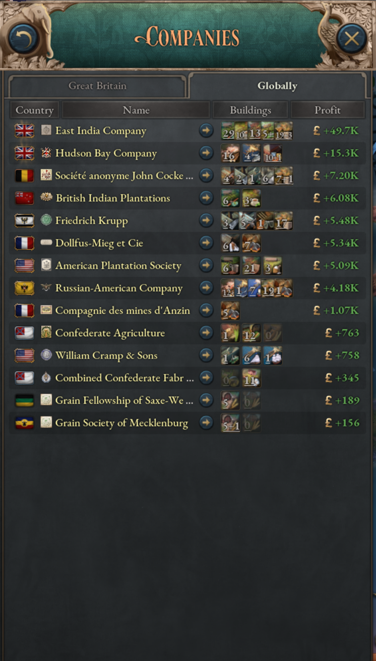 [p]Made the British East India Company, Hudson’s Bay Company and Russian American Alaska countries that are related to their respective companies which are now British and Russian respectively. Adjusted their building ownership accordingly.[/p]