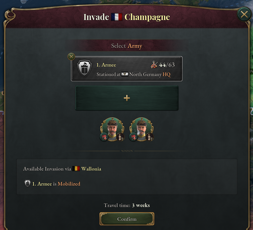 When we select Champagne, we see the panel where you select your armies. Once selected, they’ll prepare for a while.