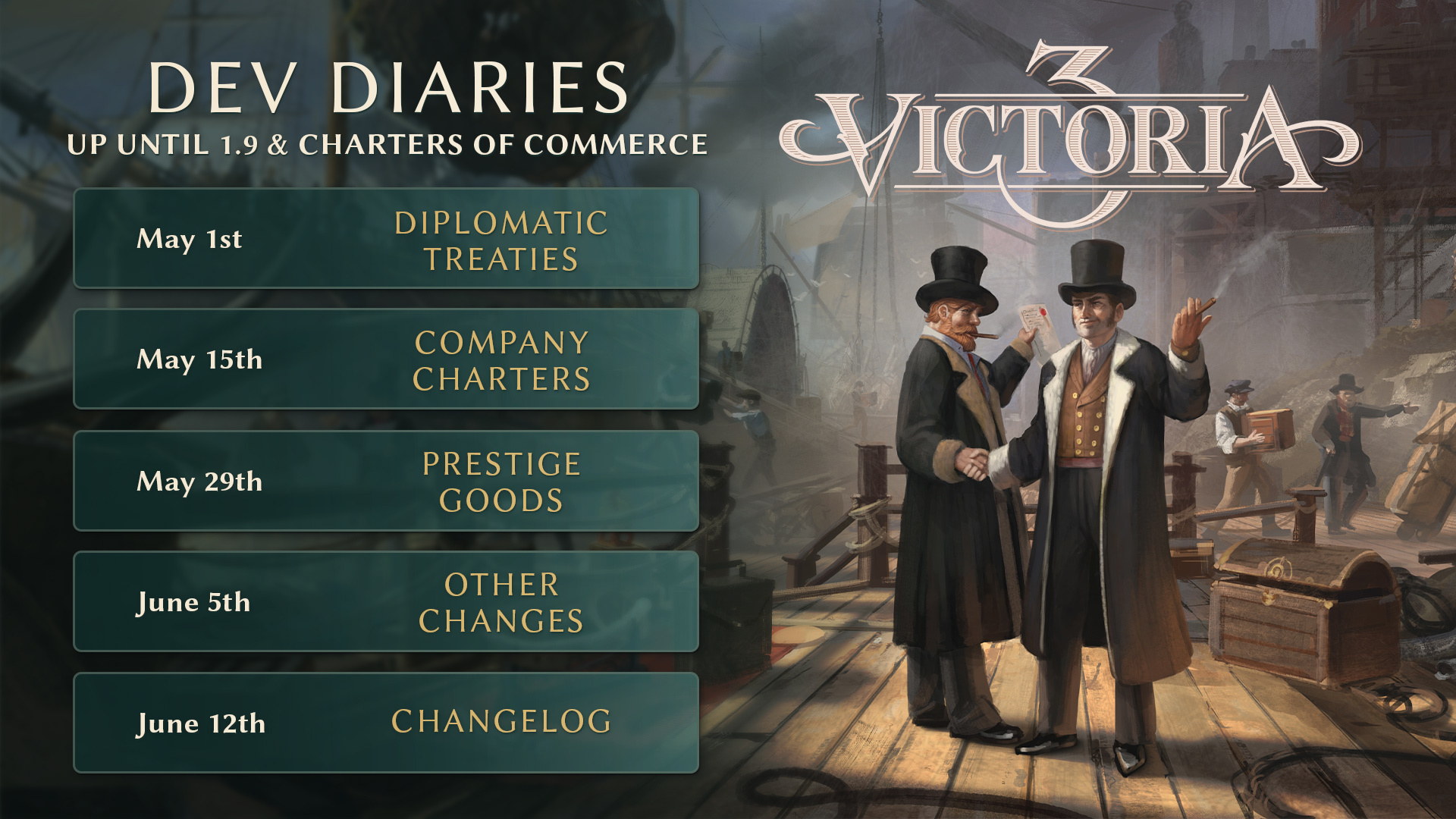 [p] [img src="https://clan.fastly.steamstatic.com/images//40579353/ed1a40ae55ca9c1e3285de61ba2bcd422f3802d4.jpg"][/p][p]Hello Victorians! A very Happy Thursday to you all! [/p][p][/p][p]With Charters of Commerce releasing next week on June 17th, we thought you might like an early look at the changelog and get even more excited a chance to start dissecting the contents before release. Alongside Charters of Commerce is, of course, an accompanying free Update; 1.9 “Lady Grey”. Keeping in our tradition of naming updates after tea, this time with a tea that is a spin on Earl Grey with orange and/or lemon peel in - personally I prefer the original with shortbread biscuits.[/p][p][/p][p]If you crave to see the mechanics pack in action before release, then we have a treat already prepared for you! This series of pre-release streams featuring Martin and Daniel attempting to make the world reliant on Argentinian beef, should satisfy that craving.[/p][p][/p][p]That is not all! Starting tomorrow we will release a series of videos going through major features coming in the pack on our video channels![/p][p][/p][p]The weekend is not only busy on our end, but sees another edition of Modcon, the friendly modder-run event that shares fascinating mods, key advice, interviews and raises money for charity. Starting tomorrow until the 15th, so check out the Victoria 3 segment![/p][p][/p][p]With that all said, welcome to the changelog![/p][p][/p][p][img src="https://lh7-qw.googleusercontent.com/docsz/AD_4nXebSj8cfEoKWv2wyQl4hykLblCCLHWpfeW8R4W3DbY4FflBku6a7_fLo3O6qqd0S_PkKLDIwYsGB7U2zvtpFVts513JiP5HpmaF5EdwfABlCpnj0HtQFoCXgZOskIOrUCRNluRzrQ?key=HZpupyM1m5ik2Qxn_nWFHA"][/p]