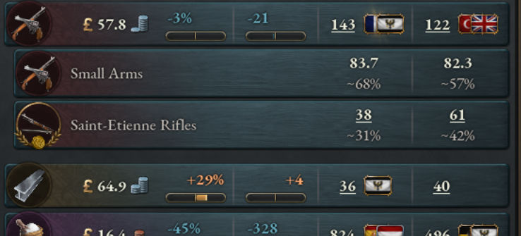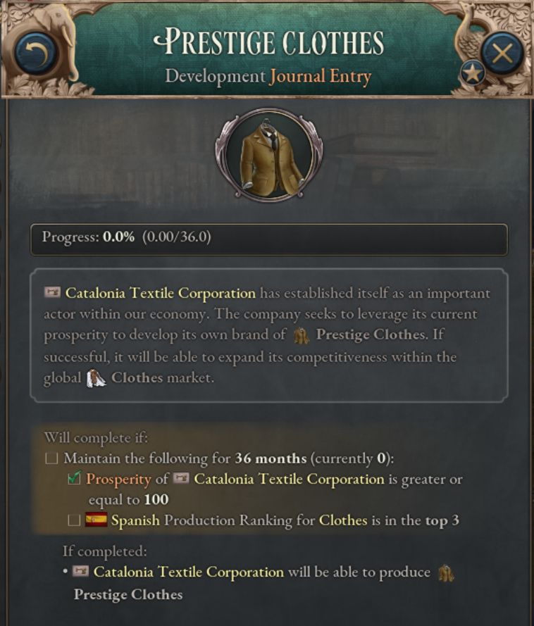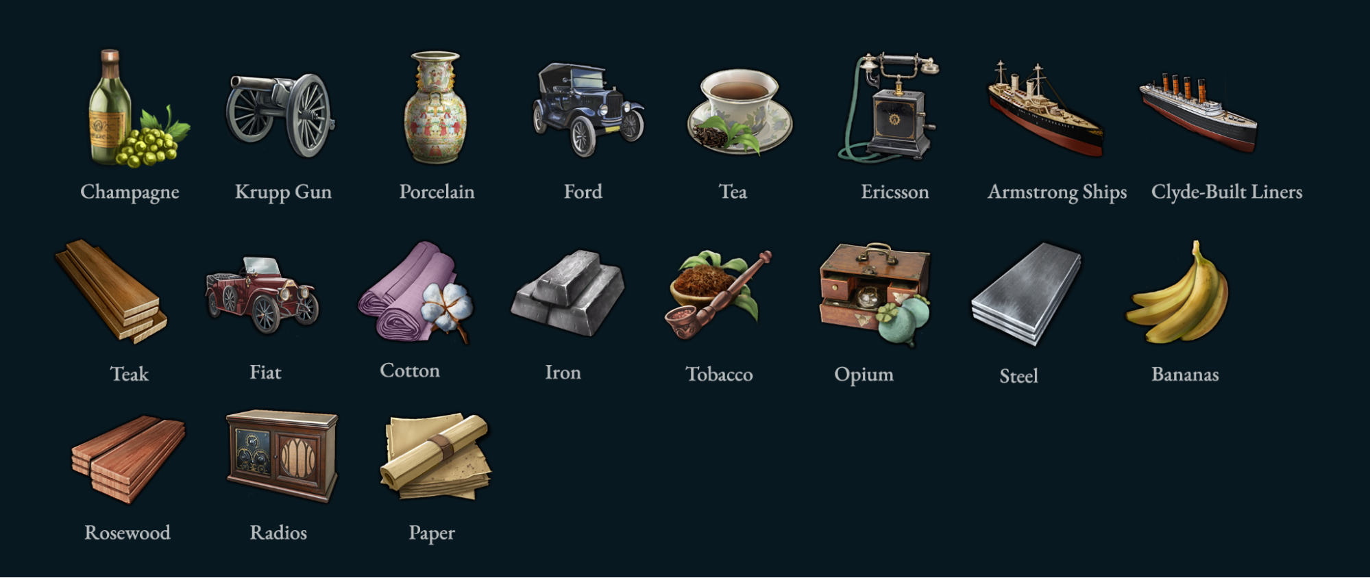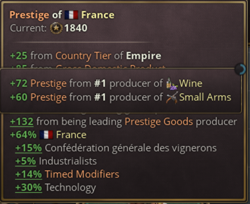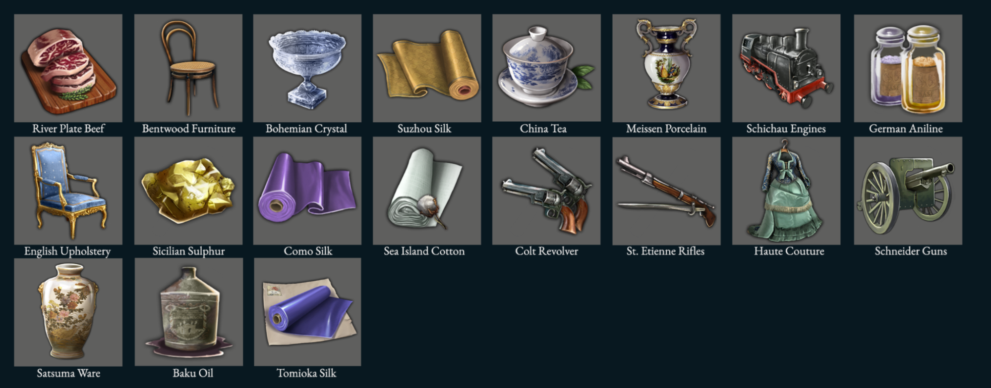 [p]Added Prestige Goods: They are luxurious or high quality variants of existing goods, e.g. Champagne replacing Wine. They are produced by companies that are prosperous and improve various aspects like a higher Trade Advantage on the World Market, shifting Pop spending if many Prestige Goods are available or providing a throughput bonus to buildings that consume Prestige Goods. There are about 35 historical Prestige Goods and 15 more generally available ones, unlocked by completion of a Journal Entry.[/p]