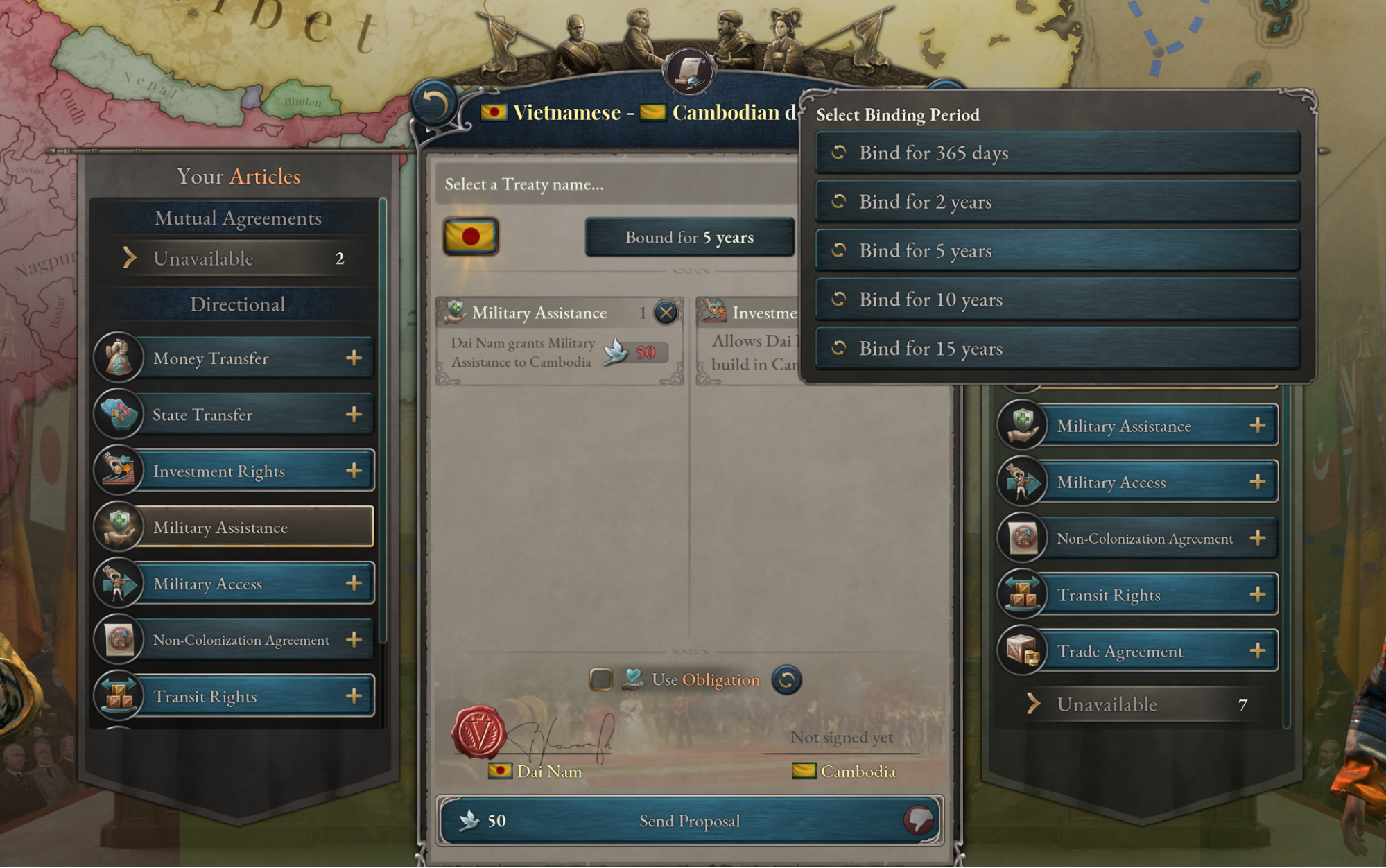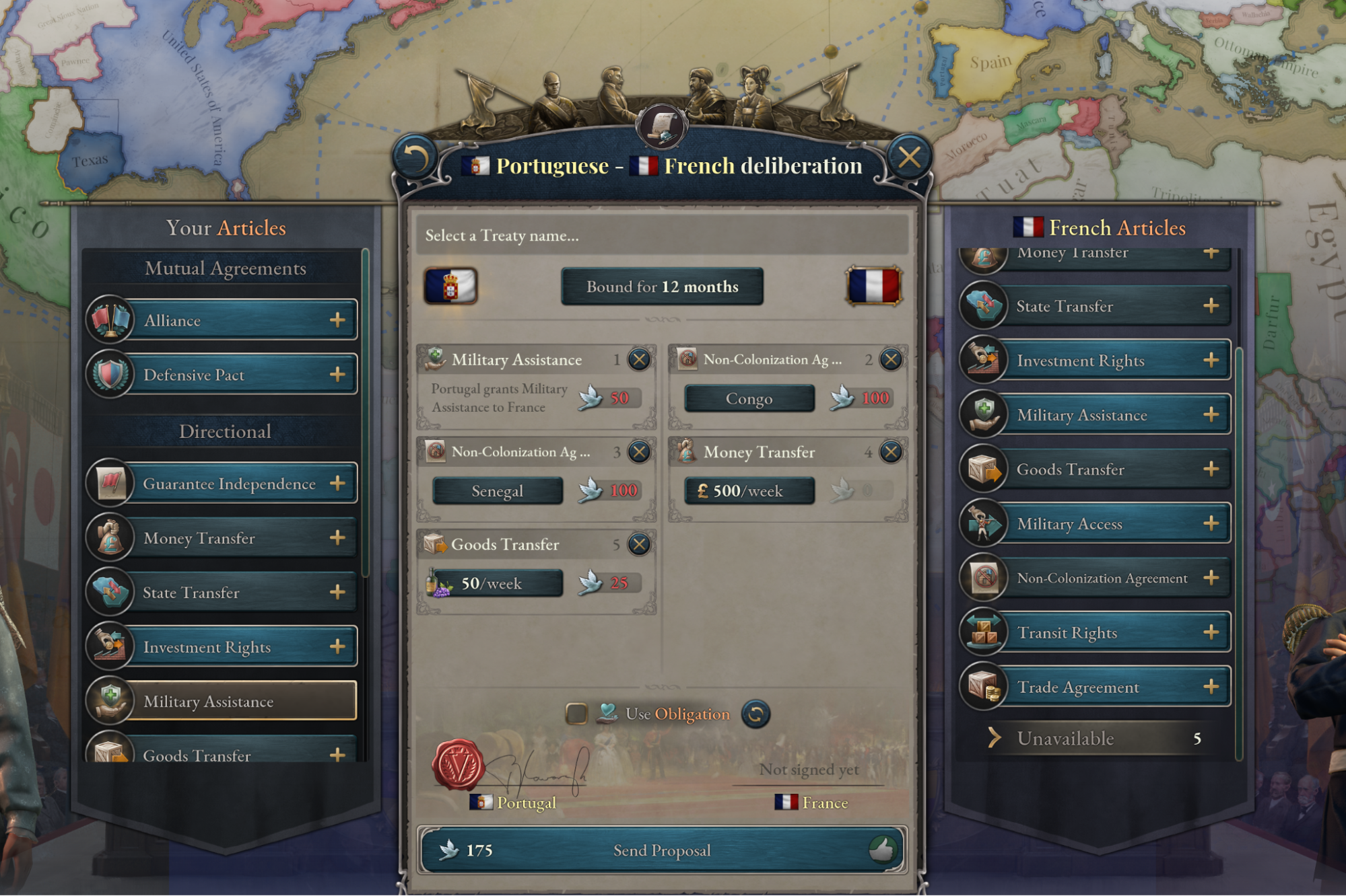 [p]Reworked how large parts of the Diplomacy system work by adding Diplomatic Treaties. Set up treaties, equal or unequal, between two countries. Add articles like Alliance, Trade Privileges or Transfer Money and mix and match between them. Other players or the AI will evaluate the whole deal with all components and can suggest changes to it to renegotiate. Alternatively, you can enforce a treaty as a wargoal during peace negotiations.[/p]
