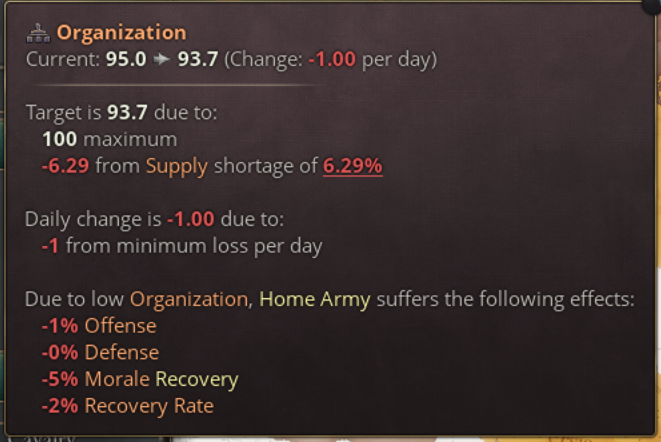 [p]Low supply no longer directly affects unit morale recovery. Instead, it now applies a multiplier to the military formation's organization.[/p]