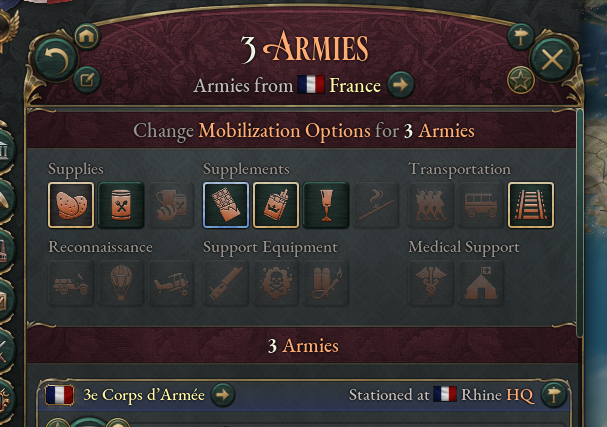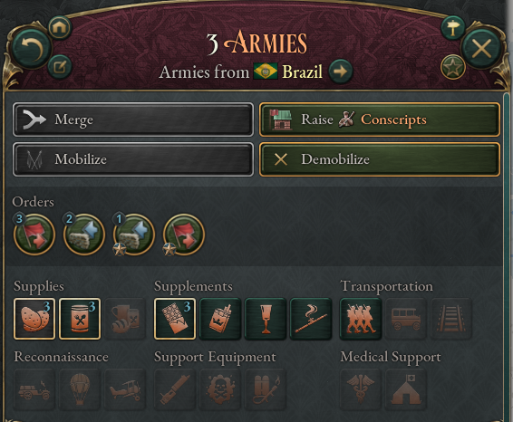 [p]Added bulk editing for formations: Select which formations you want to apply it to and you will see the new bulk editing options. Added functionality for changing mobilization options, merging armies, changing commander orders, mobilizing, demobilizing and raising conscripts of all selected armies at the same time.[/p]