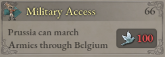 The way this is set up is via a diplomatic pact that two countries establish. It’s one-sided, so for example Belgium could grant military access to Prussia without being granted the same. Additionally, having an alliance with another country will inherently also provide military access. Note that the example of Prussia marching through Belgium is incidental and not a reference to any particular historical conflict which involved German soldiers marching through Belgium.