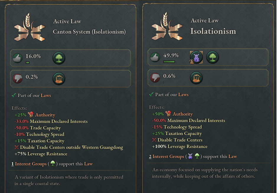 [p]Added a new unique Trade Law for Chinese-culture countries called 'Canton System', which works largely as Isolationism but allows limited trade in Western Guangdong[/p]