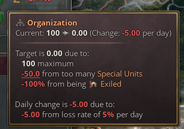 Organization drifting from 100 towards 0 at a rate of 5 per day because the army is exiled (and has too many special units)