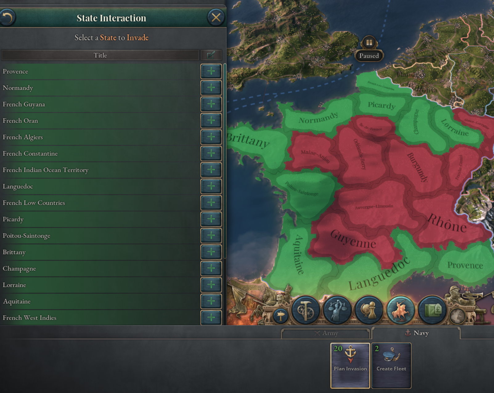 Once you press the plan invasion button, you’ll see an interface you may know from Naval Invasions already, which shows all potential invasion targets, via the sea, but also via land.
