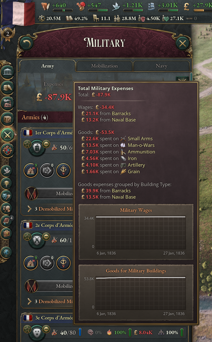 Also, the cost of war needed to be highlighted a bit more as it’s a pretty important number. So in the Military tab, you’ll find a summary of your Military expenses now.