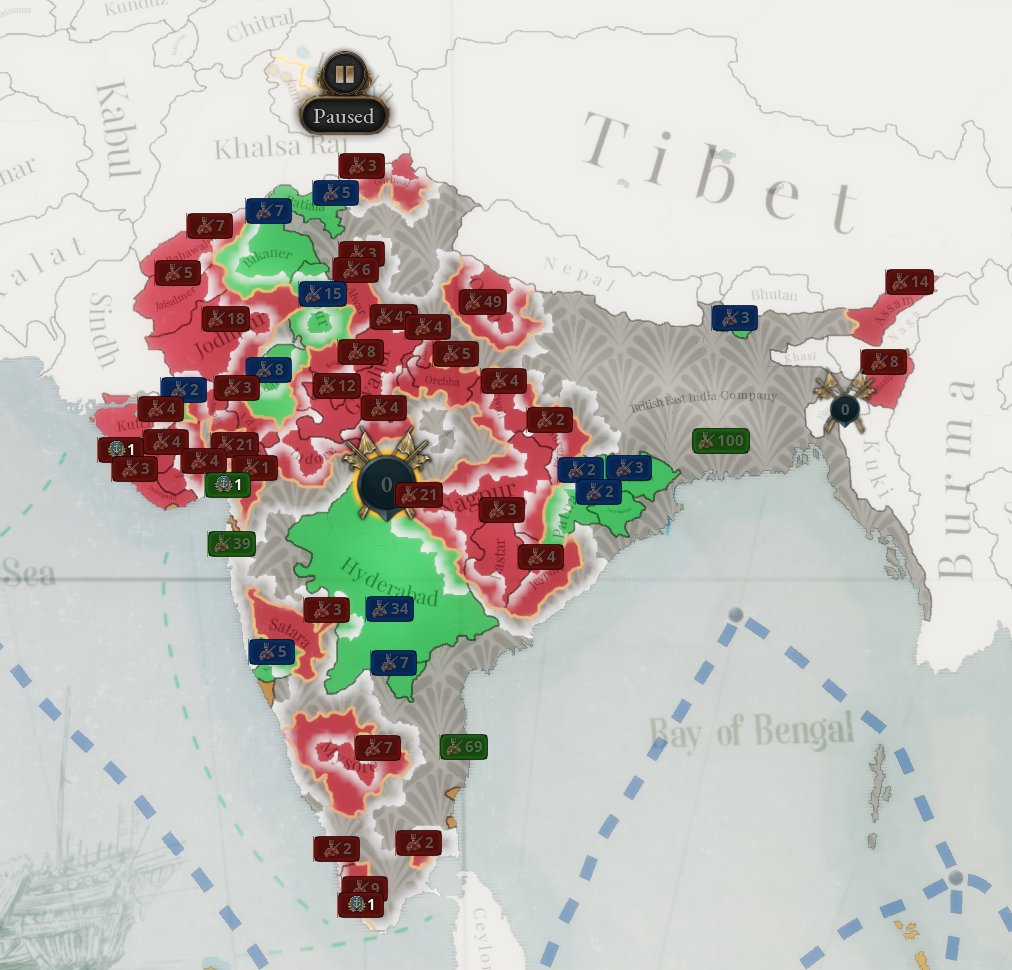 Faced with the problem of having to micro after front-splitting, we sat down to talk about some requirements and possible options. We knew that it’s impossible to fully avoid front-splitting from happening in general. But that’s okay, that was never our goal. We cared about addressing the resulting issues. One use-case we really wanted to improve was India. Well, fronts in India. Once the princely states decide they’ve had enough and declare war, we get an insane amount of frontlines generated all across the subcontinent. This is due to the algorithm of how frontlines are created. It looks at continuous pieces of land that are connected to another continuous piece of land that is owned by your enemy and then spawns a frontline between the two basically.