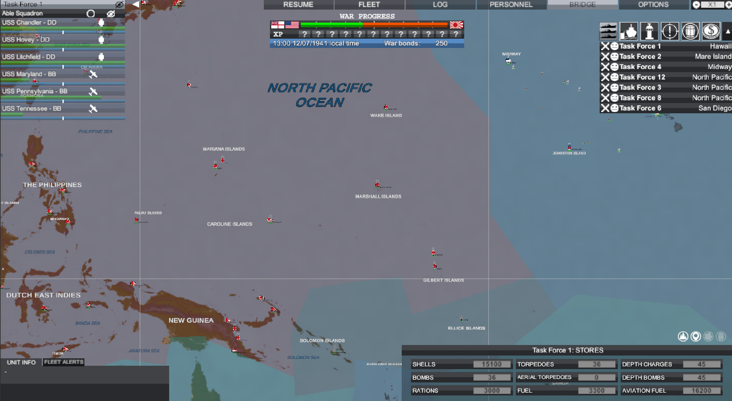One of the hardest aspects of building an open world RTS covering the entire Pacific war was creating a sensible system that would allow the player to manage the whole thing. If we had any brains we would have made the top level turn based, with the individual battles played out in real time.