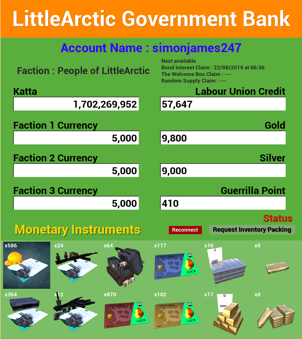 Now you have a "LittleArctic Government Bank"(LAGB) account. You can use it to manage your investments.
