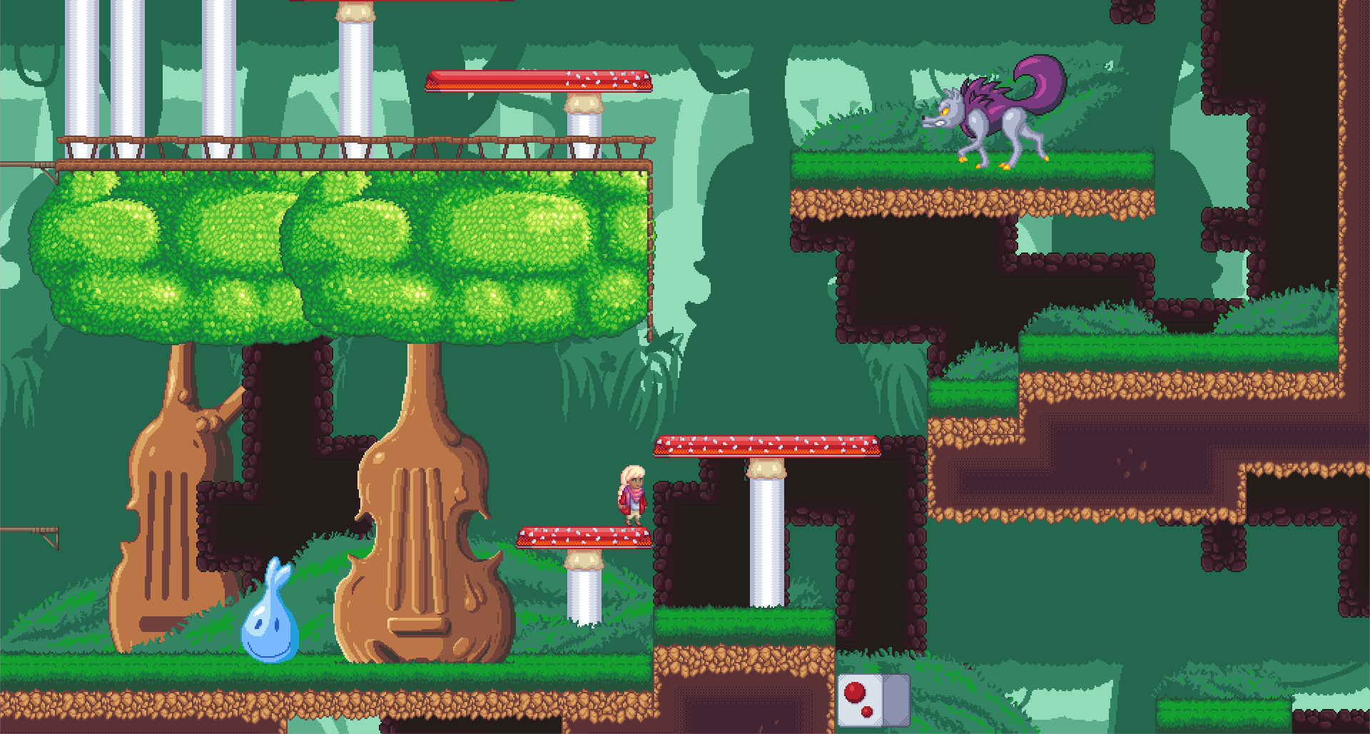 Viola is a hybrid of Platforming and JRPG. Rather than walking around in an overworld, potentially being stopped by random encounters, you're free to jump and run around the levels as you please. Don't want to fight a monster? Just go around!