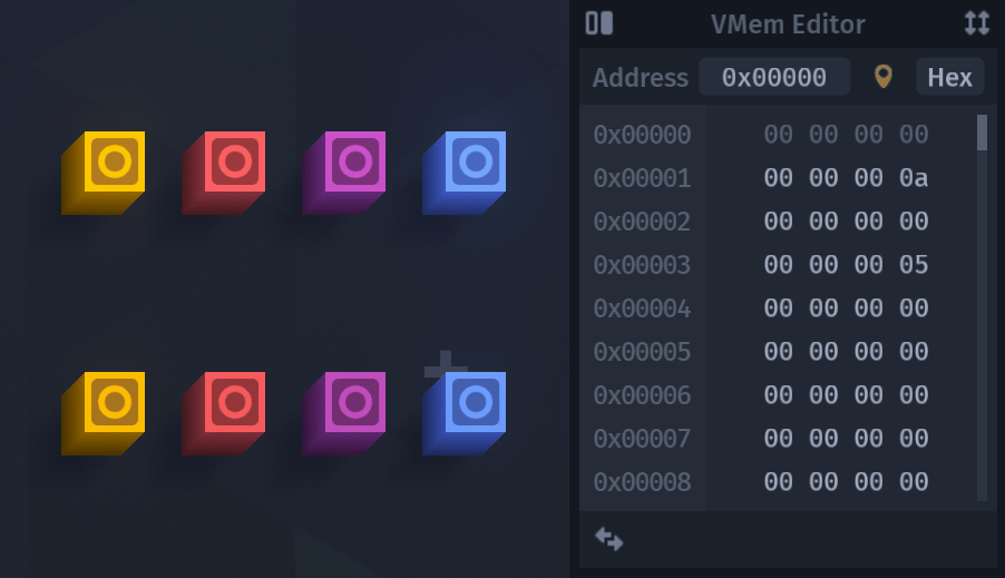 The VMem Editor enhances the workflow of building circuits that interface with the Virtual Memory. Using this panel, we can inspect the VMem when simulating projects, or modify it when the game is in edit mode.
