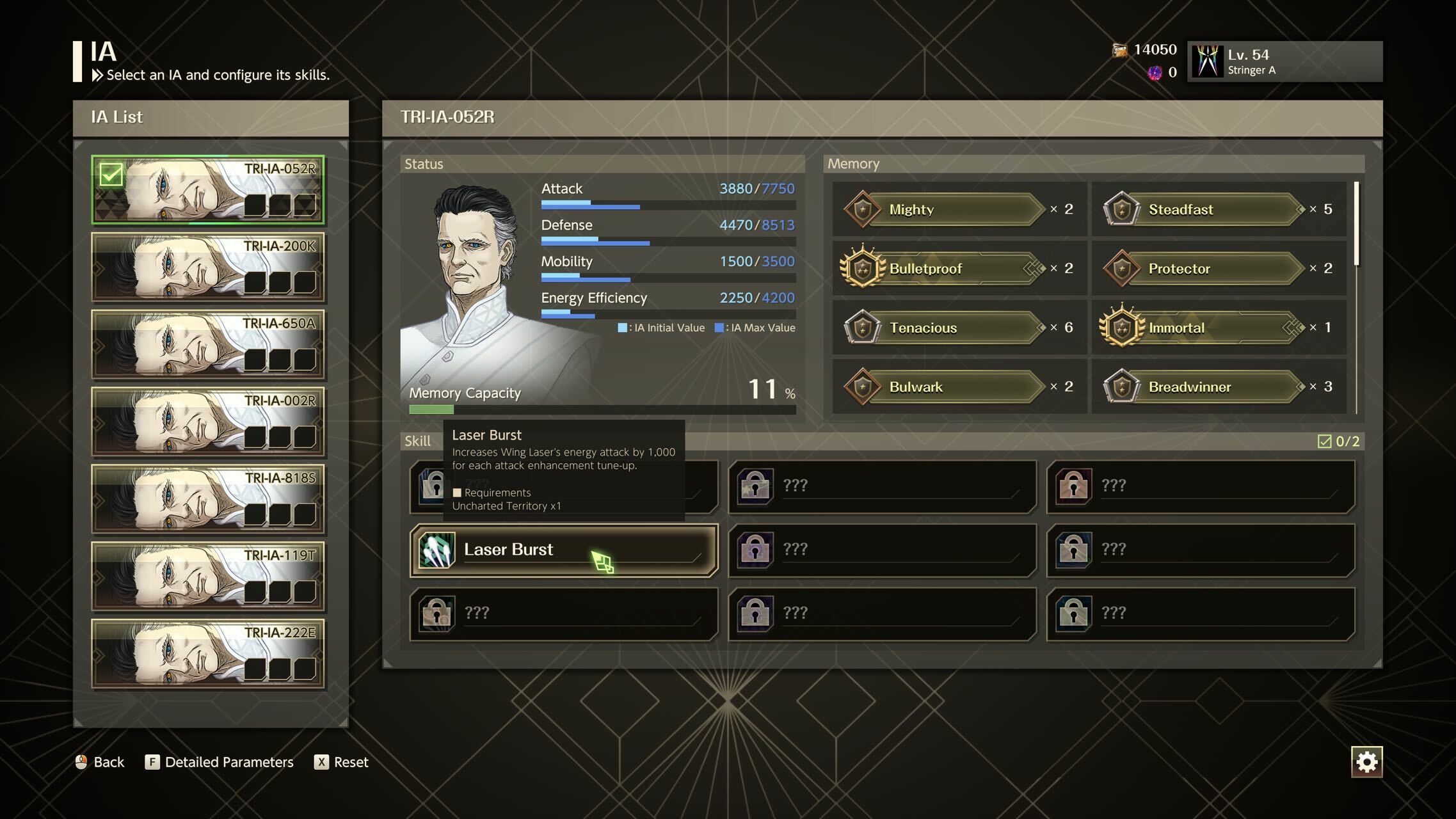 Memory: Displayed on the right side of the screen, which can be obtained by meeting certain conditions in the game. The memory capacity of each IA is limited and the player should consider how to allocate the memory for each game. Equipping Memory can increase corresponding values and improve the basic performance of VA.