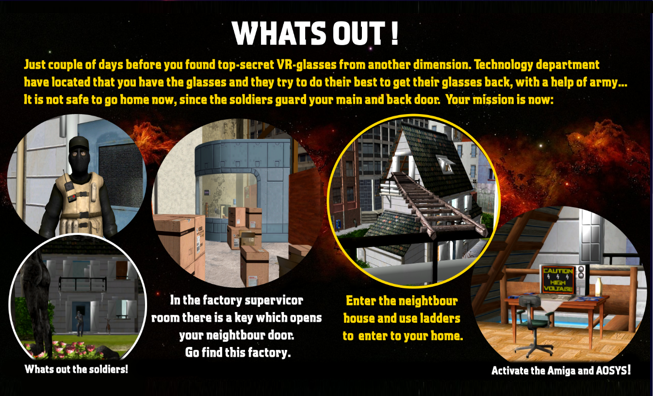 Couple of bugs etc have been found: Someone has seen eagle flying inside the ground, that eagle has now been hunted down. In home-level your mission is to find Amiga and activate it by going near to that, anf on the current build that is not so well triggered, so you will need to literally jump to the table to push on your Amiga and then you will enter to the AOSYS. Known bugs will be fixed on the next update, which will also bring other improvements!