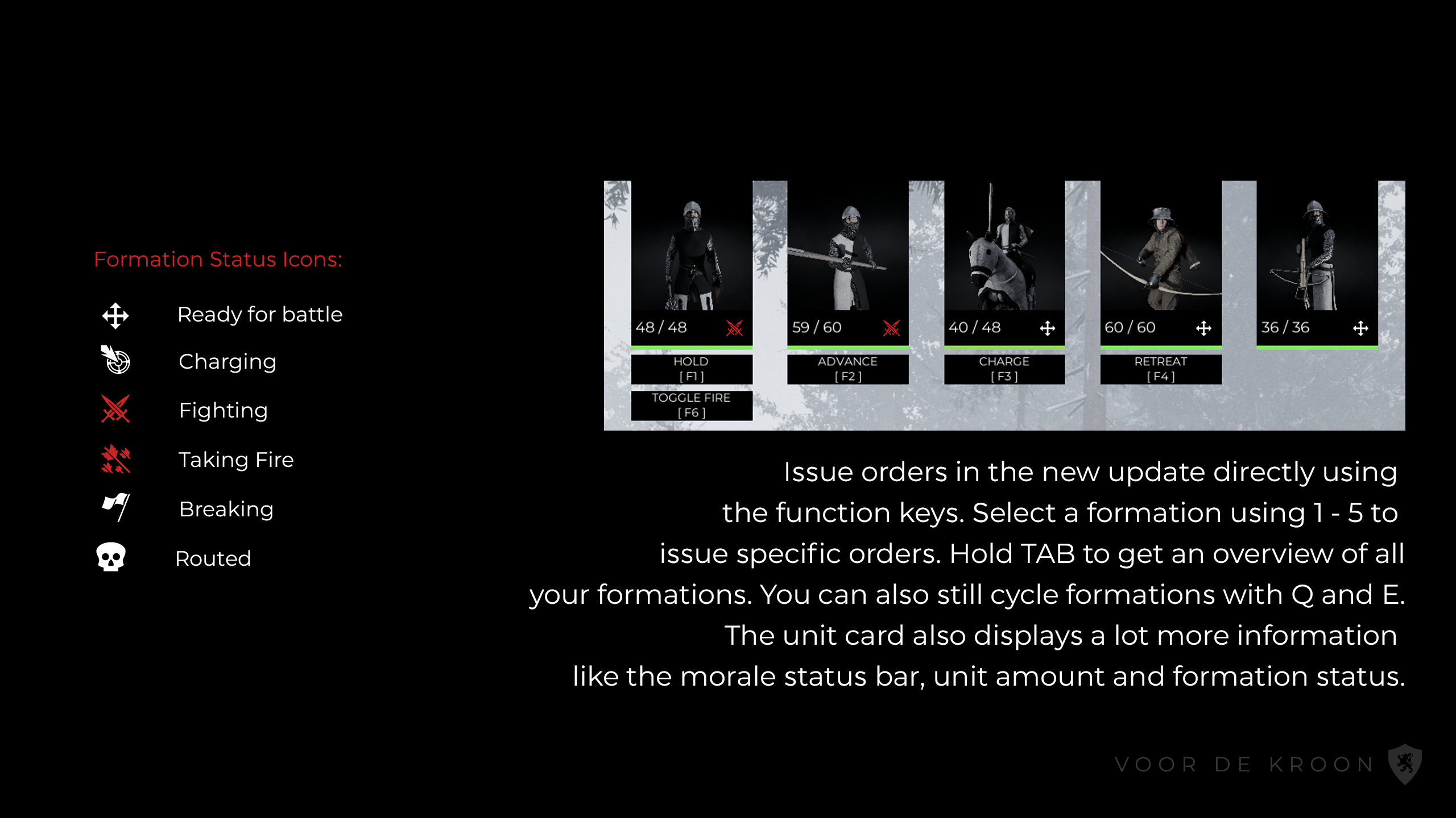 With this new update you can control your army by directly selecting units with the 1 - 5 number keys and issue orders with the F1 to F6 keys. The TAB button now functions as a formation status lookup and shows all unit cards with their status when held.