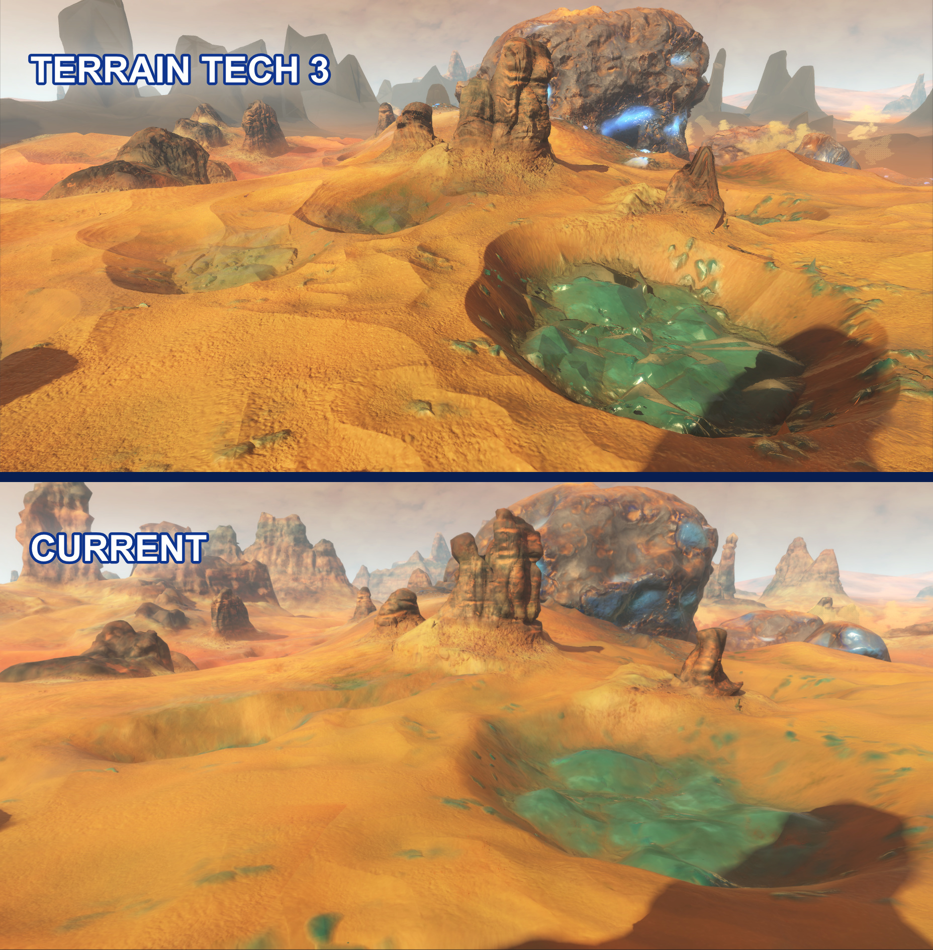 The terrain solution at launch was working, but ultimately push came to shove when we started running out of memory and file size to cram new content the game as we patched and improved it. So the lion’s share of memory use, which was still taken up by our terrain system, needed to be readdressed in order for us to improve the game further. Enter TT3.