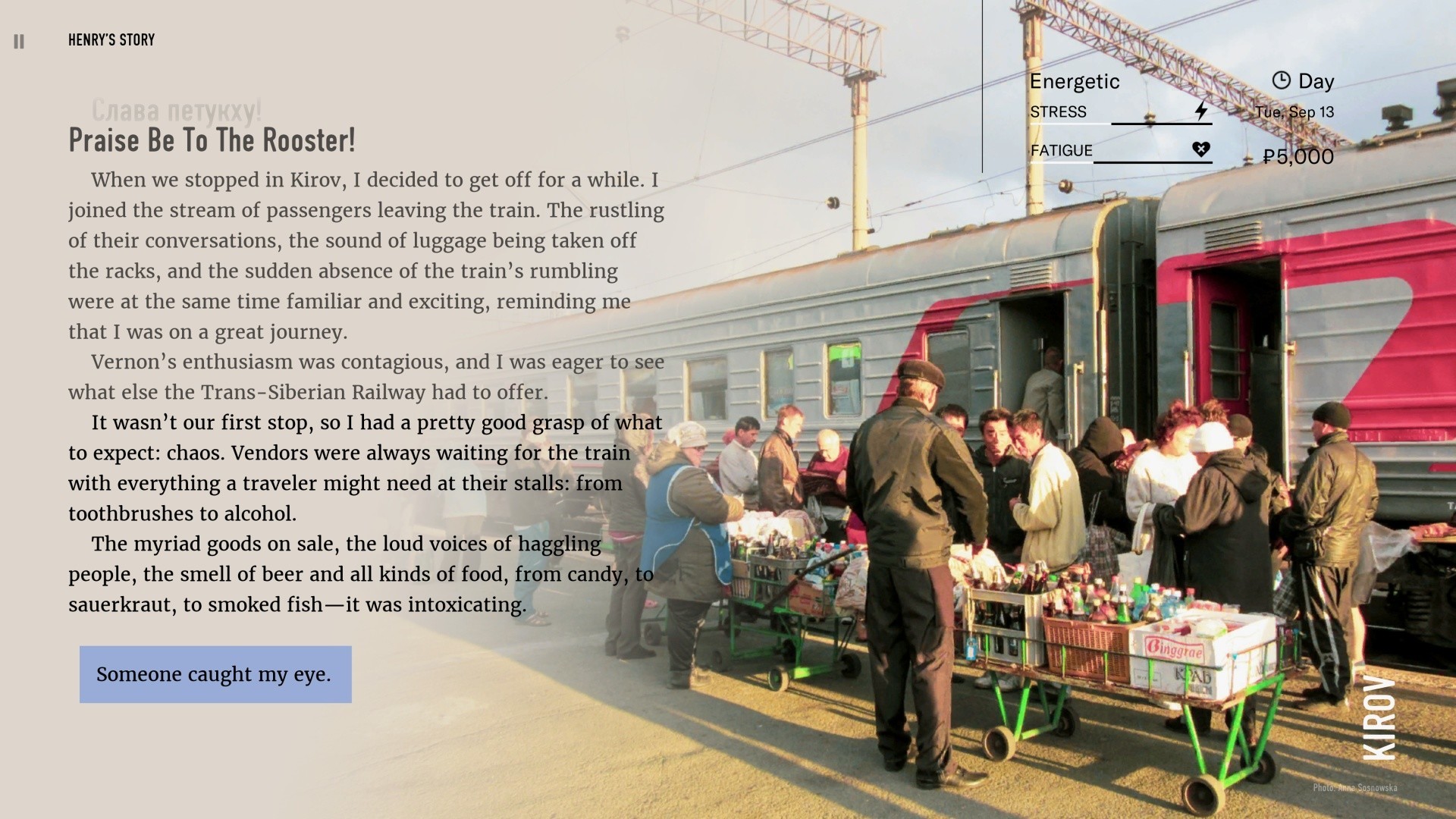 Wanderlust: Travel Stories is a literary experience, and we made sure nothing distracts you away from the text. The static photos and illustrative soundscapes are there just to bring back memories or stir your imagination. The user interface is also very basic, its most important elements are stress, fatigue, and mood — showing the emotional state of the character and its influence on the story. This mechanism is described in the next sections of this text.