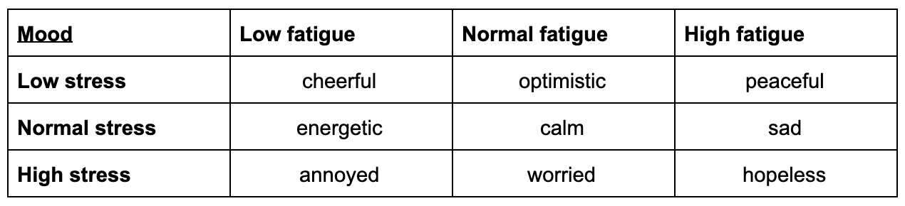 Low stress, high fatigue, mood: peaceful