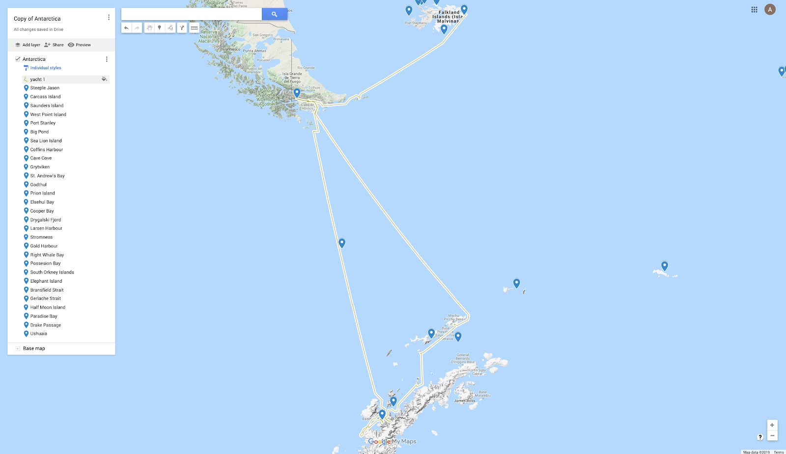 We start on the Falkland Islands/Islas Malvinas, sail west, then south, and back to Ushuaia.