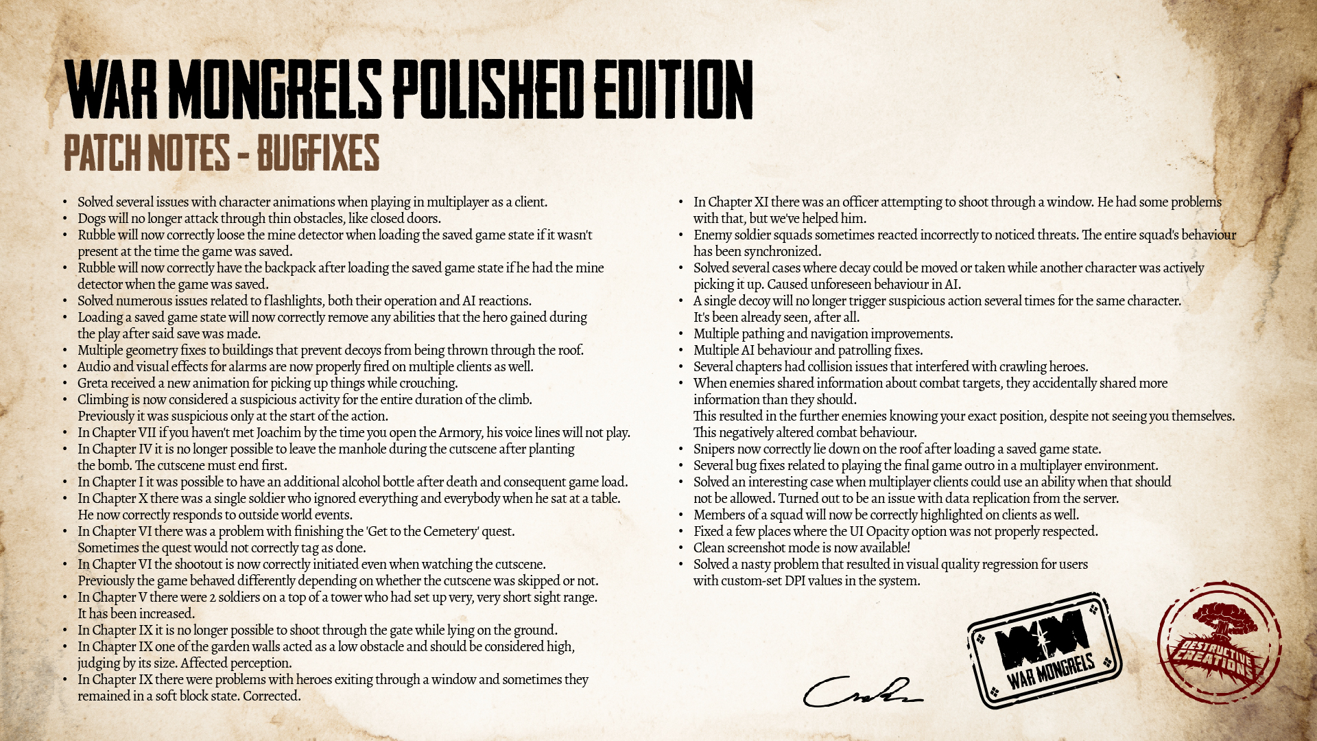 We are incredibly excited to finally release the update we've been working on for the past few months. We feel like we pooped the bed a bit last year and we're happy to present War Mongrels as initially envisioned.