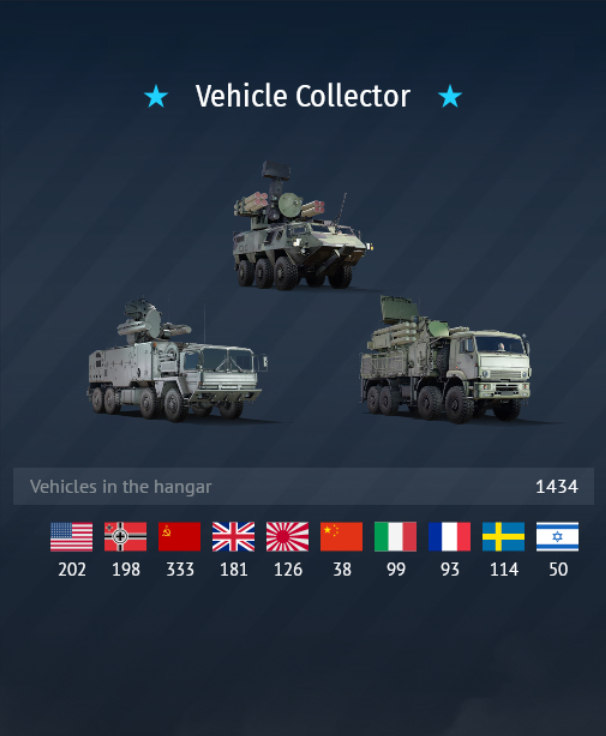 - Vehicle Collector — here, you’ll show off 1 to 3 vehicles of your choice that you’ve unlocked. The number of vehicles you have unlocked per nation and the total number are also displayed. Below are some random examples: