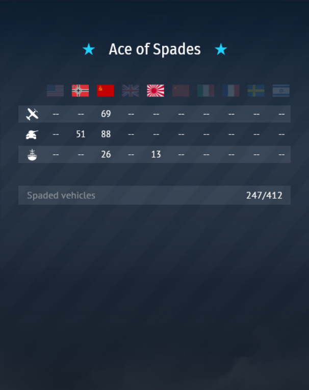 - Ace of Spades — here, you’ll show off the number of spaded vehicles that you have per nation. Selected types of vehicle from selected countries are also shown so that you can see how many more vehicles you need to spade to be 100%!