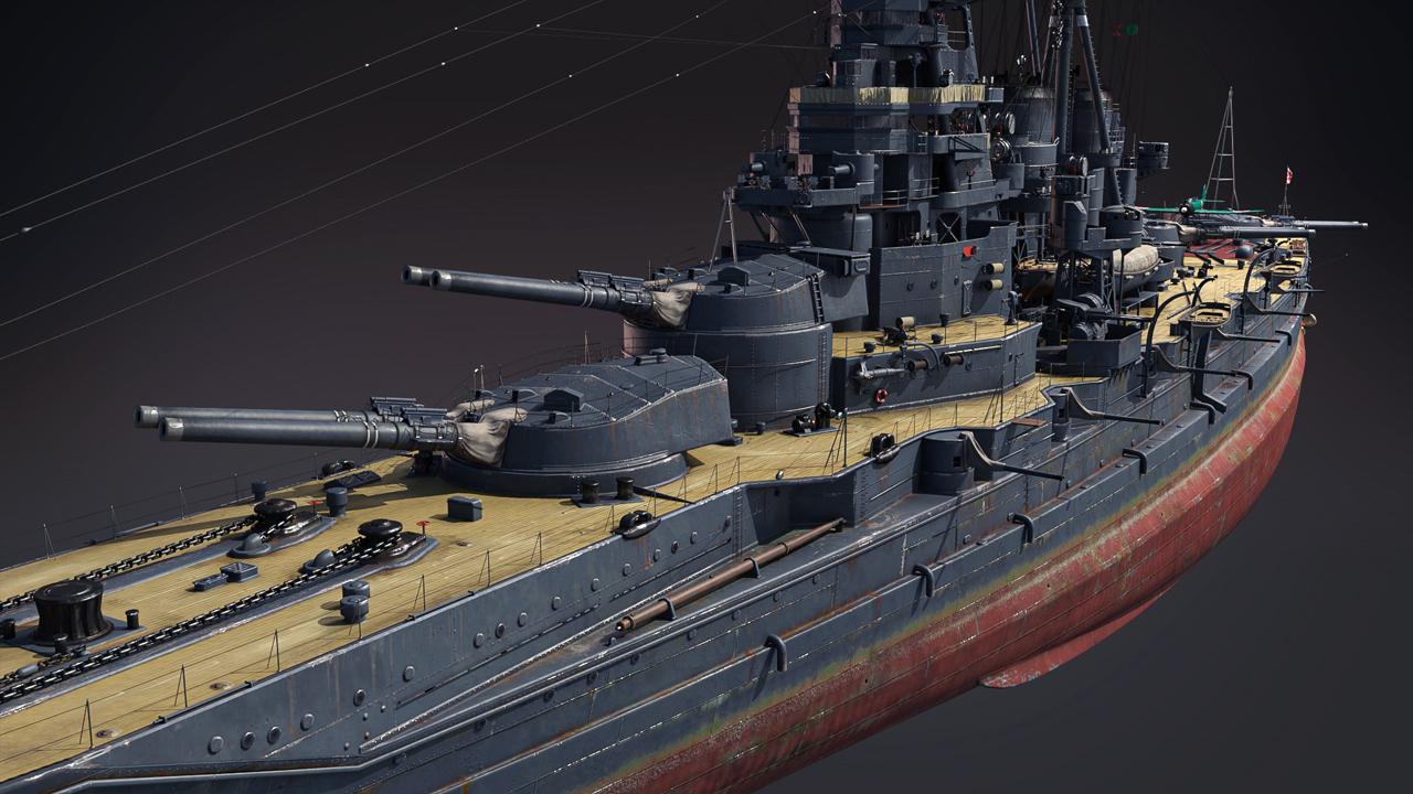Undoubtedly, one of the main advantages of the Kongō class is the powerful main caliber armament, with the Kirishima not being an exception here. Eight 356 mm caliber guns in four turrets with a top crew can fire two salvos a minute! These guns being able to fire high-explosive, armor-piercing or semi-armor-piercing shells that are capable of hitting any target at all firing ranges. Unlike IJN Kongō, IJN Kirishima has more auxiliary guns — 14 placements with 152 mm guns that each are rapid-fire and have good guidance. Despite this upgrade, there’s less anti-aircraft guns though. Four placements with twin 127 mm guns are responsible for long-range defense, however on close approaches, enemy aircraft will be met with ten twin 25 mm cannons. This is still quite good, however if you’re accustomed to the guns on the Kongō, the anti-aircraft weaponry on the Kirishima will not feel great when being attacked by aircraft.