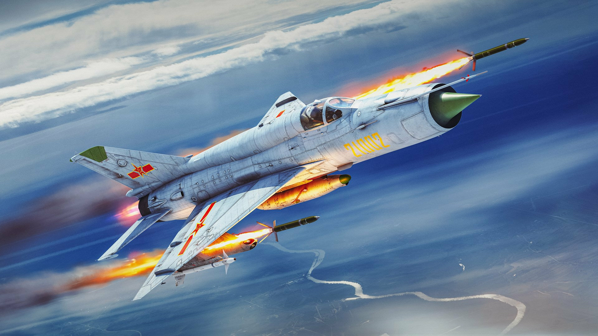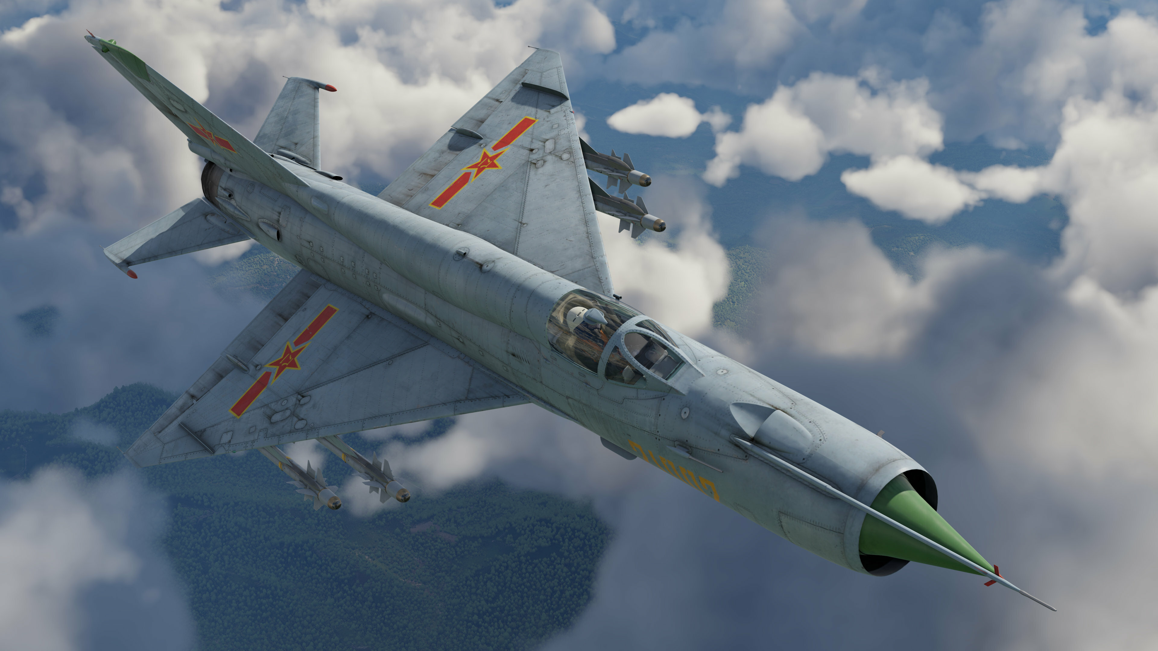 In air battles, the J-7D relies primarily on its impressive speed and rate of climb, where it can easily catch up with an enemy and disengage from combat. It’s armed with a powerful 23 mm cannon and can take a number of IR-guided missiles. It has flares for use against air-to-air missiles, and for hitting ground targets has rockets and small bombs.