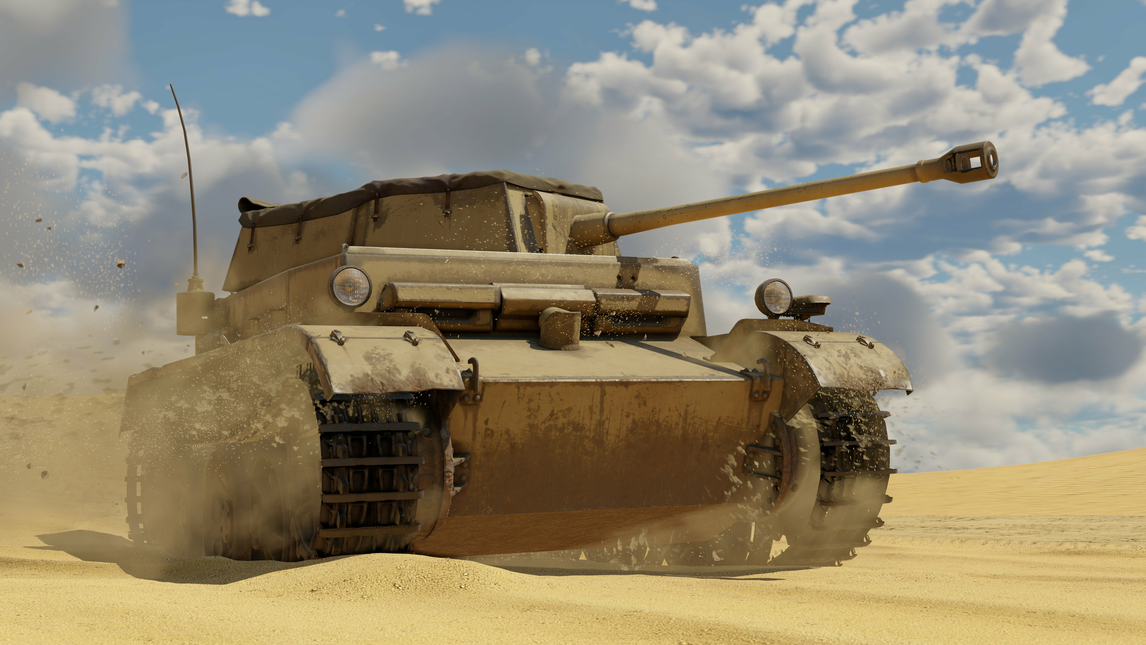 But that’s not all. Ground vehicles have always been able to get covered in mud, snow and sand, but we’ve now worked to make this mechanic more elaborate and realistic. Before the Firebirds major update, the surface of an entire map consisted of one material; either sand, dirt or snow. But now, the areas of the surface you drive on can have different materials, meaning ground vehicles can get covered with different types of mud at the same time. In addition to being able to clean off dirt in water as normal, you can now fire your main caliber gun and use the physics of that to “shake and blast” that dirt off. Pretty awesome!