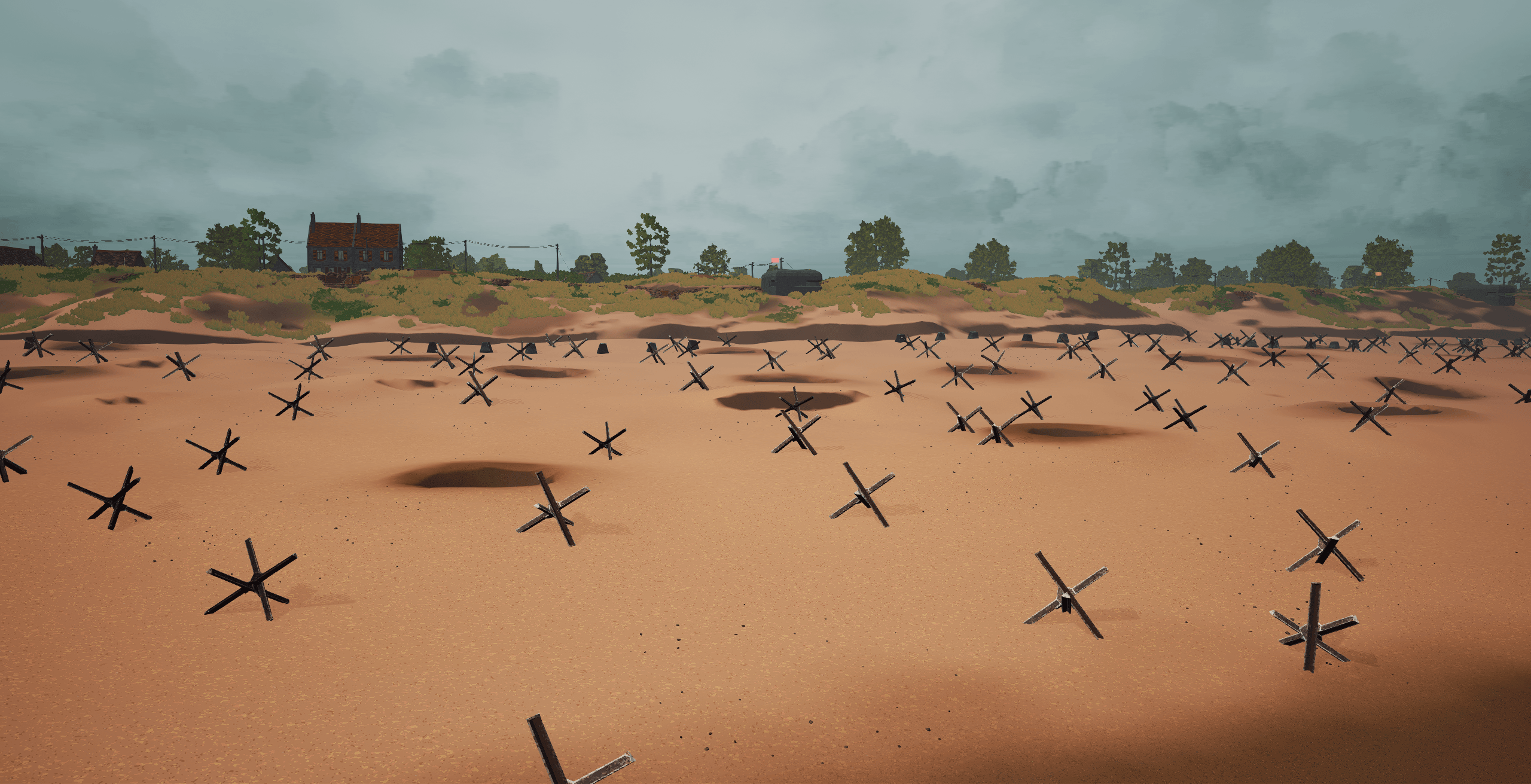 Our level design team made quick work of this map in just a few short weeks following the reveal announcement, creating new foliage and tree assets, new modular building pieces/sets, new bunker assets, new lighting work, and more. There is still a lot more work to be done with this map, however basic functionality is there and the map is fully playable and coming together nicely (although at the moment we are testing with US vs Germans since we are still working on the Japanese faction! More WIP images of this can be found below, we hope to have the proper faction in very soon).