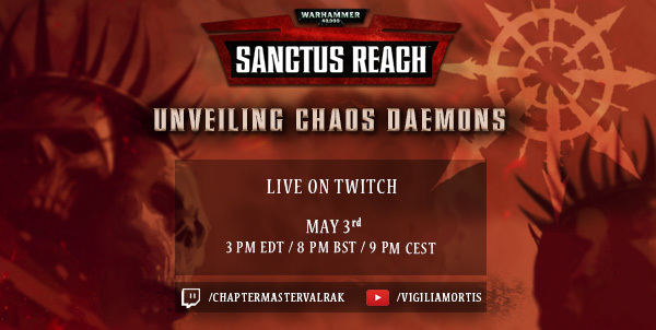 But before we get to our last Chaos God diary, let's start with an announcement: the humble servant of the Imperium, Chapter Master Valrak himself, is going to face the Daemonic hordes of Chaos live on Twitch tomorrow at 8 pm CEST on his Twitch channel!