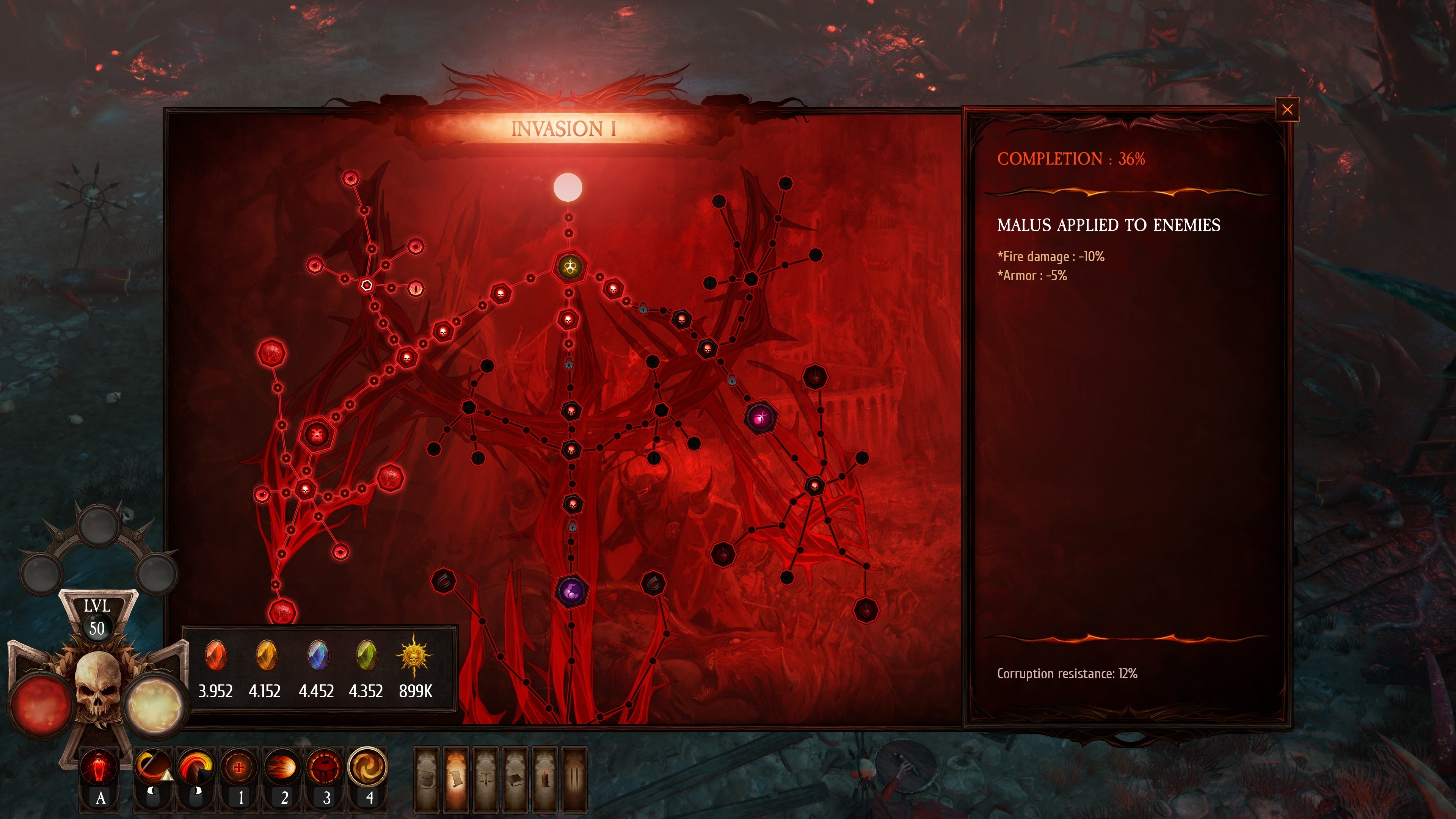 An Invasion map is played out on randomly generated levels from specific acts, Boss Fights or Arena battles with waves of enemies. Each Invasion tree node may be modified by some alterations, depending on the dark god they’re related to (poison for Nurgle, Magic Shields for Tzeentch as examples).