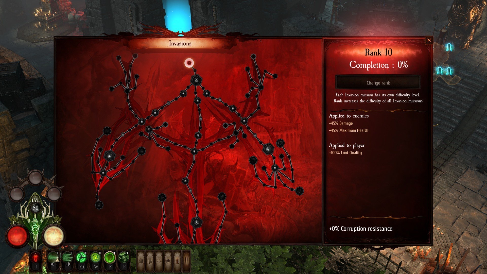 During this time, you’ll also be fighting against Corruption. This manifests as a life draining effect that players will have to endure. Each map has a corruption value, which becomes increasingly harsher the further a player moves away from the origin of the Invasion node trees. At the end of each invasion tree branch, you unlock powerful rewards that are exclusive to this mode, including: new skills, new heroic jewels and new potion effects.