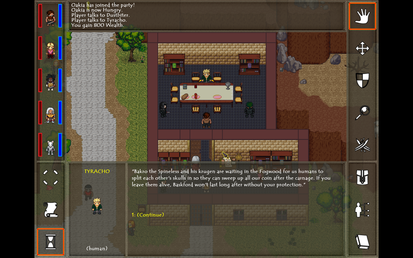 [p]Fixed major bug from a recent patch that made travelling impossible because new characters started out in Major Battle mode (thanks to an email report).[/p][p]Finished the end-game slides and added 5 new achievements. Also, there is now an "Easy Mode" that removes the hunger mechanics but also disabled achievements.[/p][p]Plus a few other tweaks and minor bug fixes.[/p][p][/p][p]Complete list of changes:[/p][p][/p][p]-New Achievements: Anarchy, Propagandist, Andresi Rescued, Lizardfolk Friend, Pigfolk Partner.[/p][p]-Finished Ch.5 endgame slides (Companion relationships and Quinn's Plot rep).[/p][p]-Added Easy Mode option to character creation to disable the Hunger mechanic.[/p][p]-Fixed sprite position when waking from unconscious status during dialogue.[/p][p]-New rooftop objects around Noble District roof edges to fix draw priority.[/p][p]-Amulet of the Self now makes wearer immune to mental effects.[/p][p]-Added a few Potions of Attunement to Jadenbury in Ch.5.[/p][p]-Added some aged mobiles and sprites for Ch.6.[/p][p]-Improved death script of Gazer monsters.[/p][p]-Updated all manuals.[/p]
