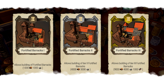 Each level of the Fortified Barracks unlocks new, more advanced unit types while limiting lower-tier options, giving you a strategic choice on when to upgrade and which troops to field as the game progresses.