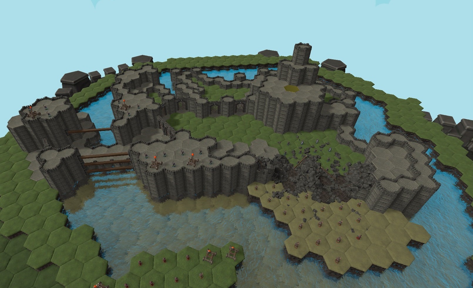 Open combat, on a deserted and sandy island-fort. There's no where to hide on this map, so make sure you get some double kills. Take the center catapult for both a catapult and a height advantage. This screenshot was taken with an orthographic perspective because it's pretty :3