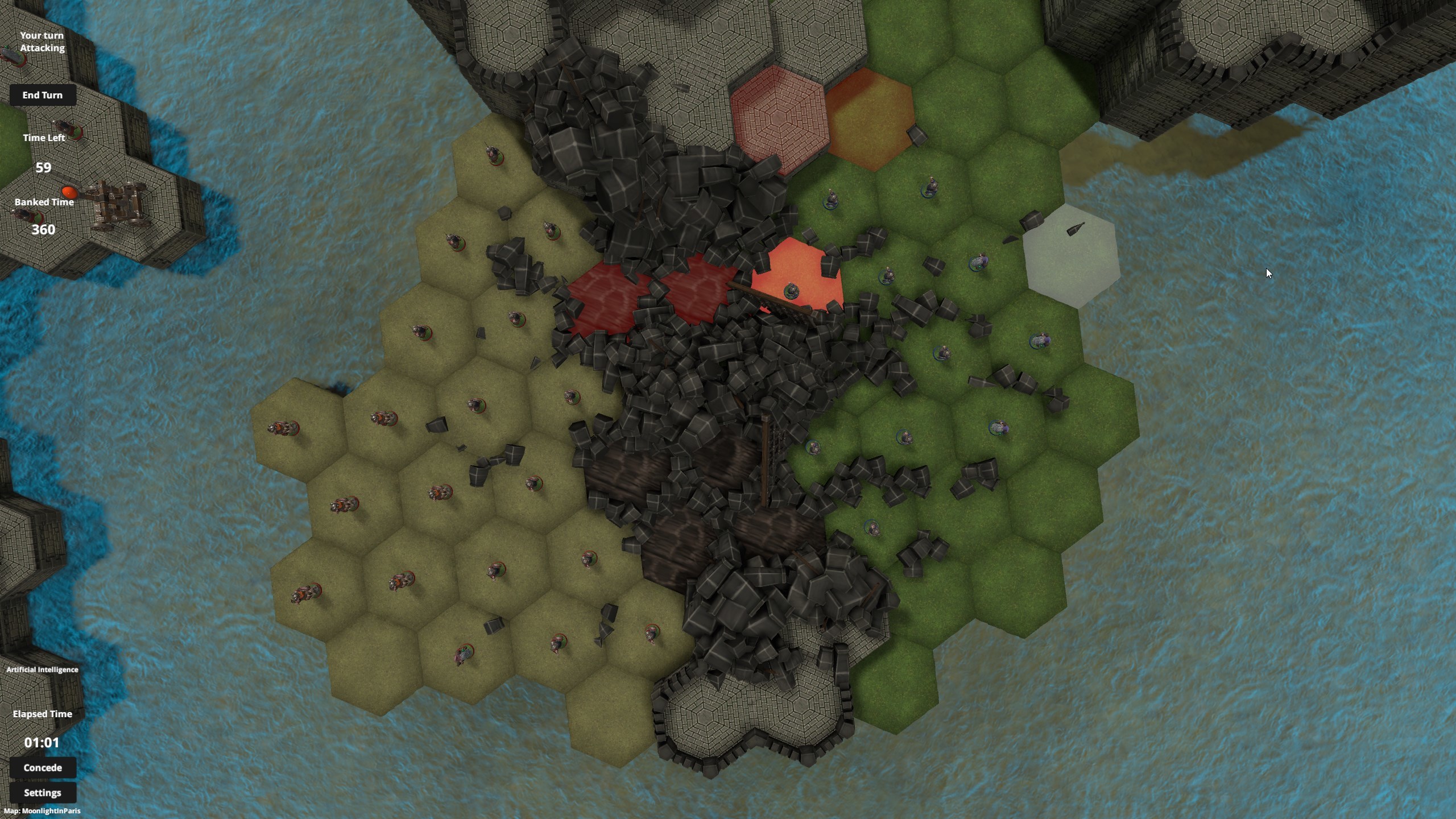 No neutral catapults on this map. Battle for control of the slightly elevated cover in the ruins of a castle wall. Larger army size, perfect for competitive play.